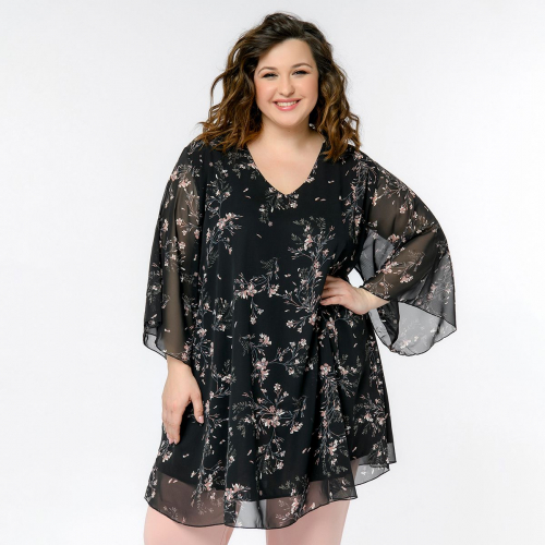 Туника  свободного силуэта из шифона. V-вырез горловины. Рукав расклешенный, линия плеча спущена.