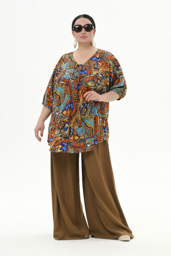 Свободная туника из принтованного штапеля с цельнокроенным рукавом. Верхняя часть на кокетке. Нижняя часть со сборкой по шву притачивания кокетки. Вырез горловины фигурный, завязывающийся на шнурочек из основной ткани.