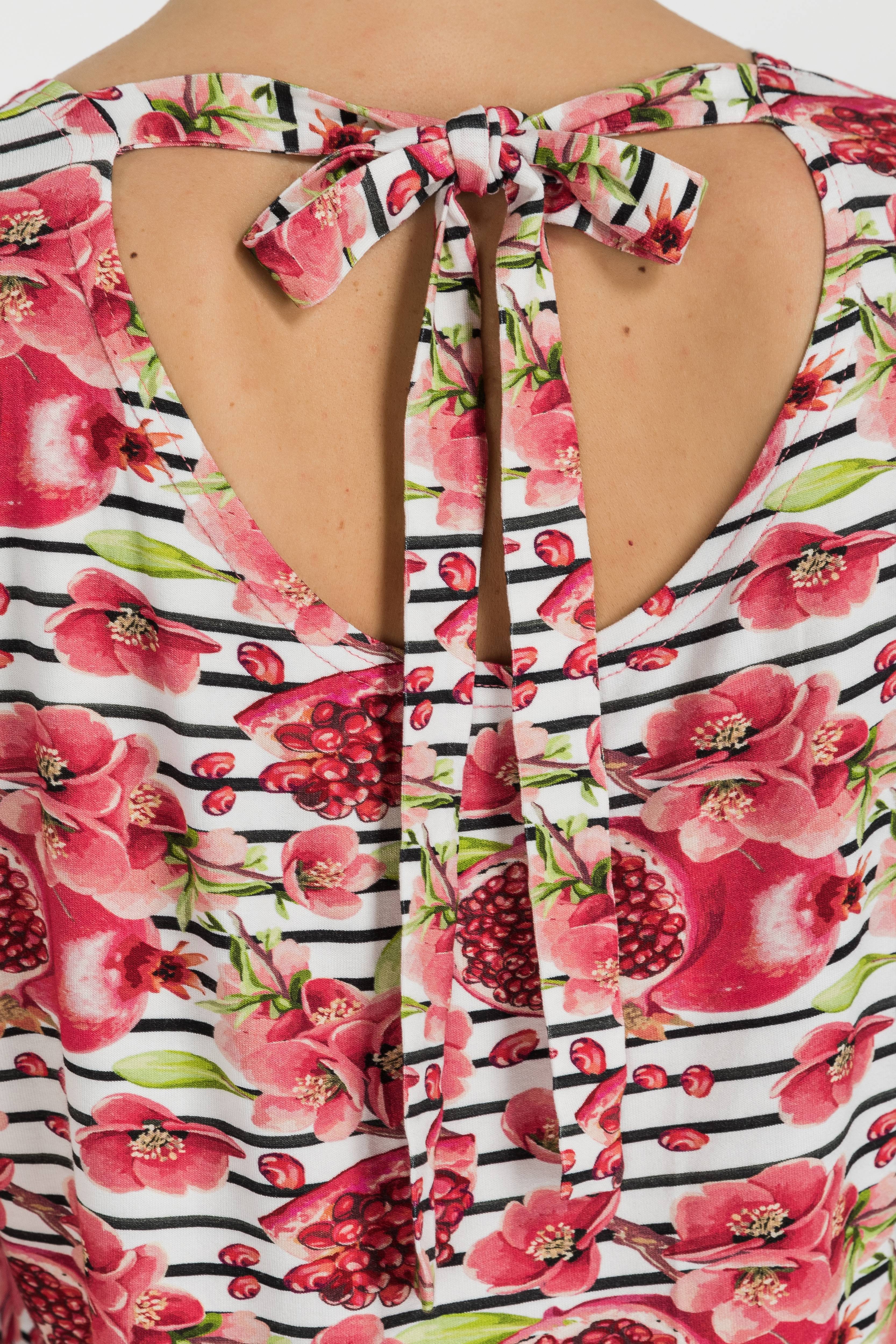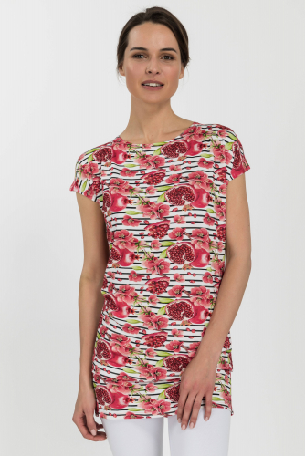 95% вискоза/ 5% эластан Туника прилегающего силуэта, покроя "летучая мышь", с коротким рукавом, длиной выше колен. Вырез горловины: по полочке - "лодочка", по спинке - круглый, углубленный с завязками на бант. На рост 164 см.