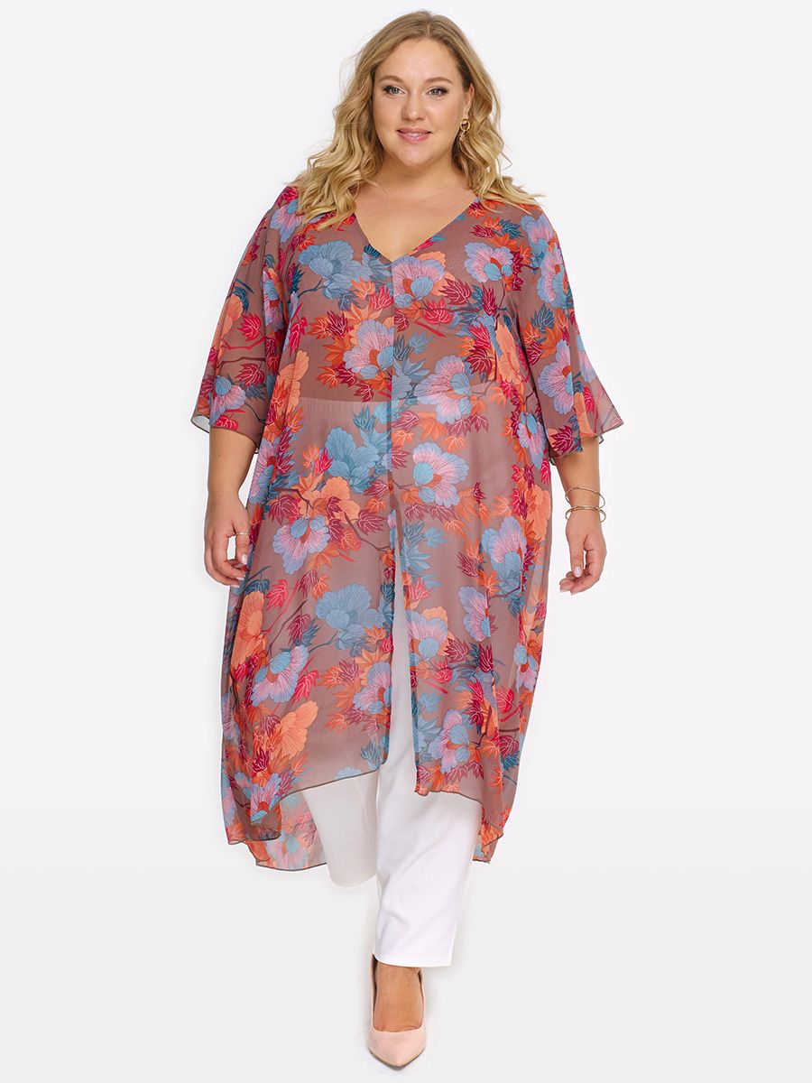 Туника удлиненная асимметричная, шифон кофейный, принт яркий