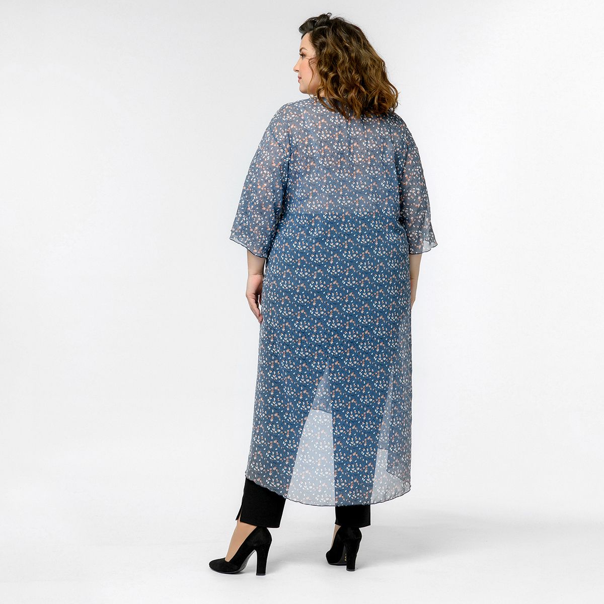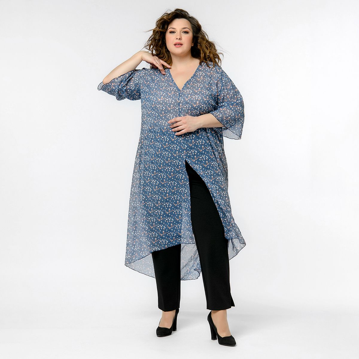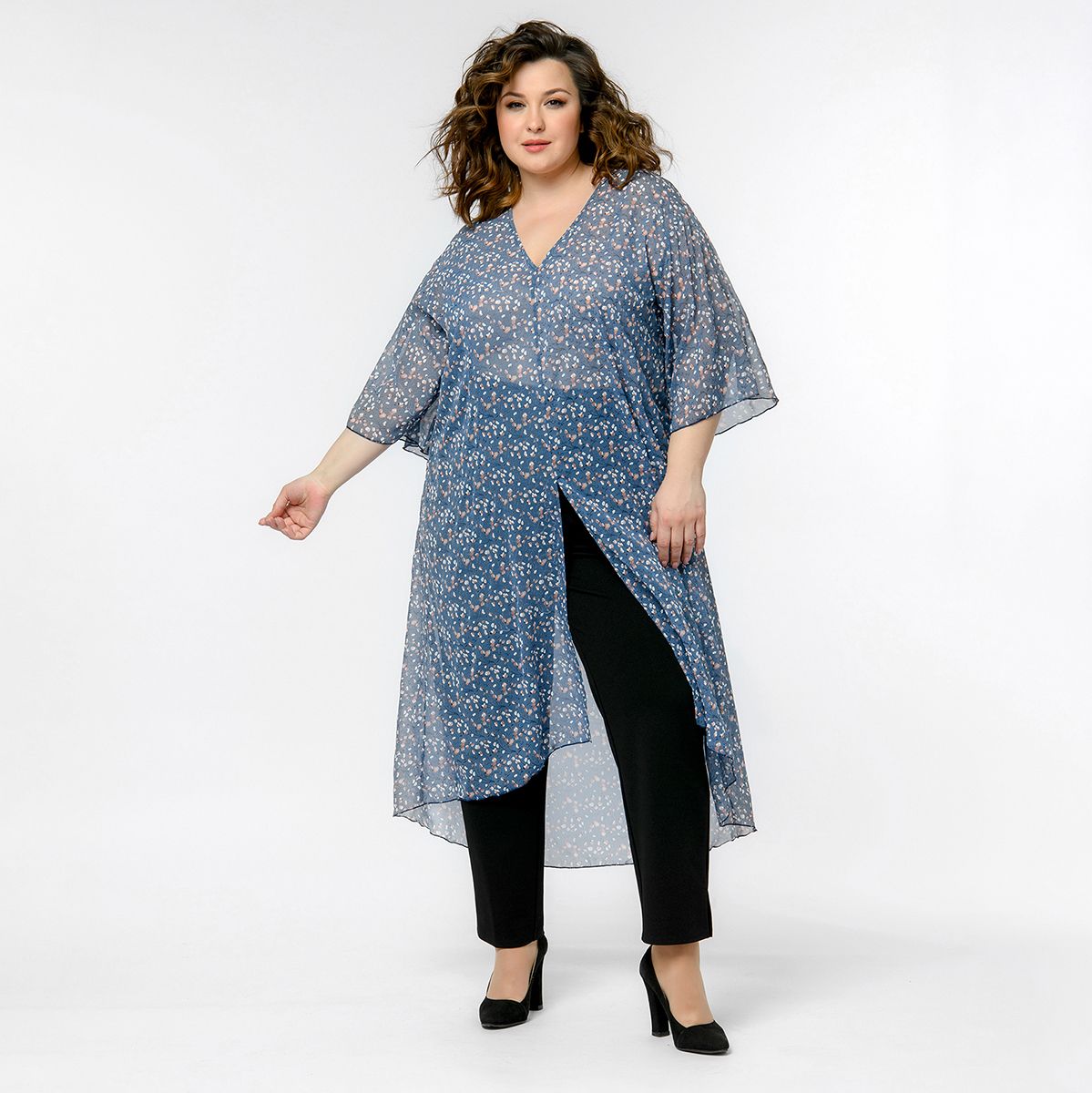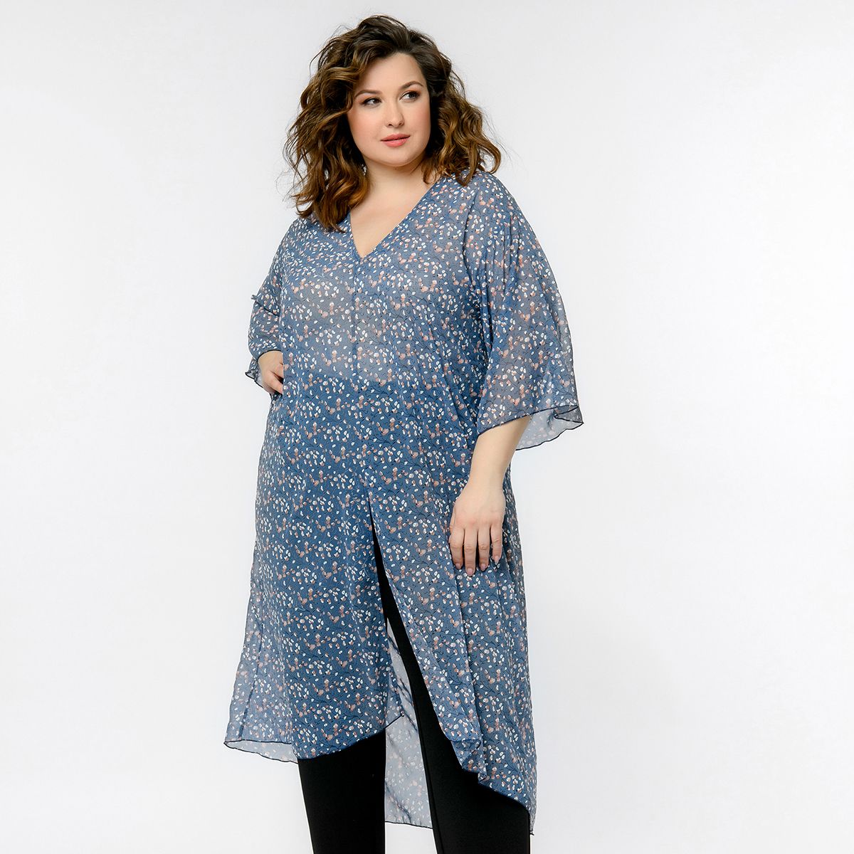 Легкая удлиненная туника с разрезом спереди и широкими рукавами из шифона.