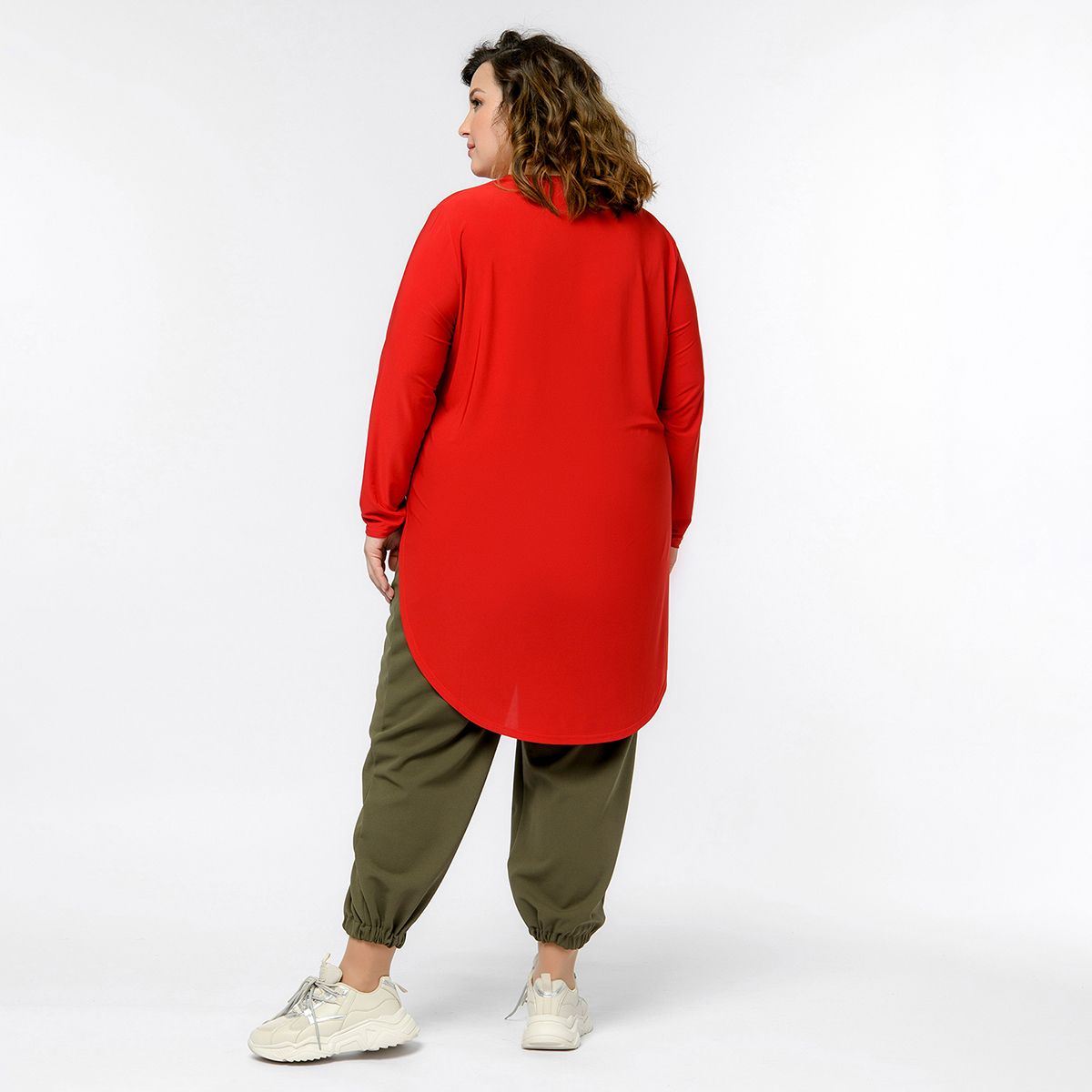 Туника из струящегося трикотажа "масло" свободного кроя. Рукав втачной, длинный. Вырез горловины округлый. Линия низа закругленная у боковых швов. Спинка длиннее переда на 12 см.