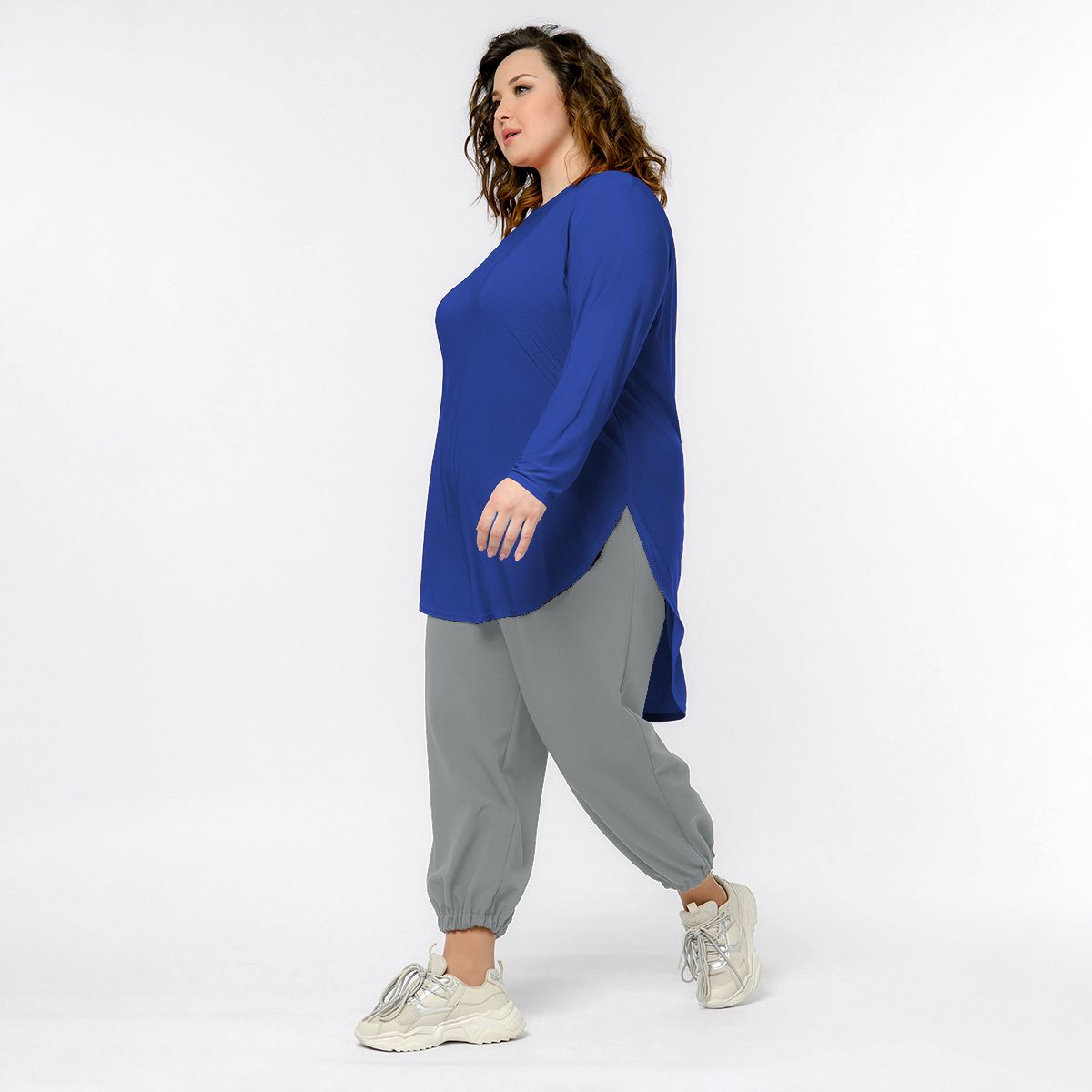 Туника из струящегося трикотажа "масло" свободного кроя. Рукав втачной, длинный. Вырез горловины округлый. Линия низа закругленная у боковых швов. Спинка длиннее переда на 12 см.