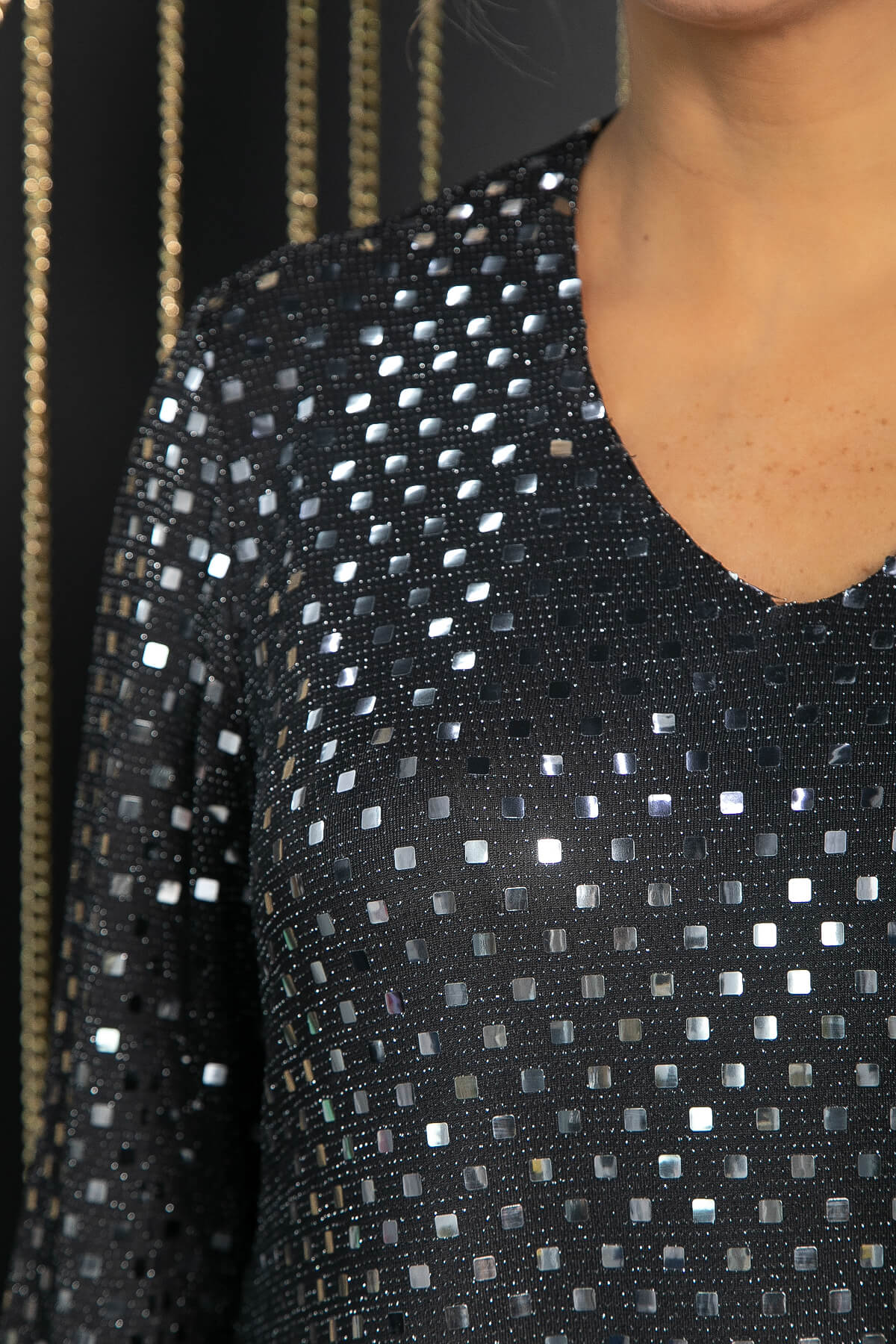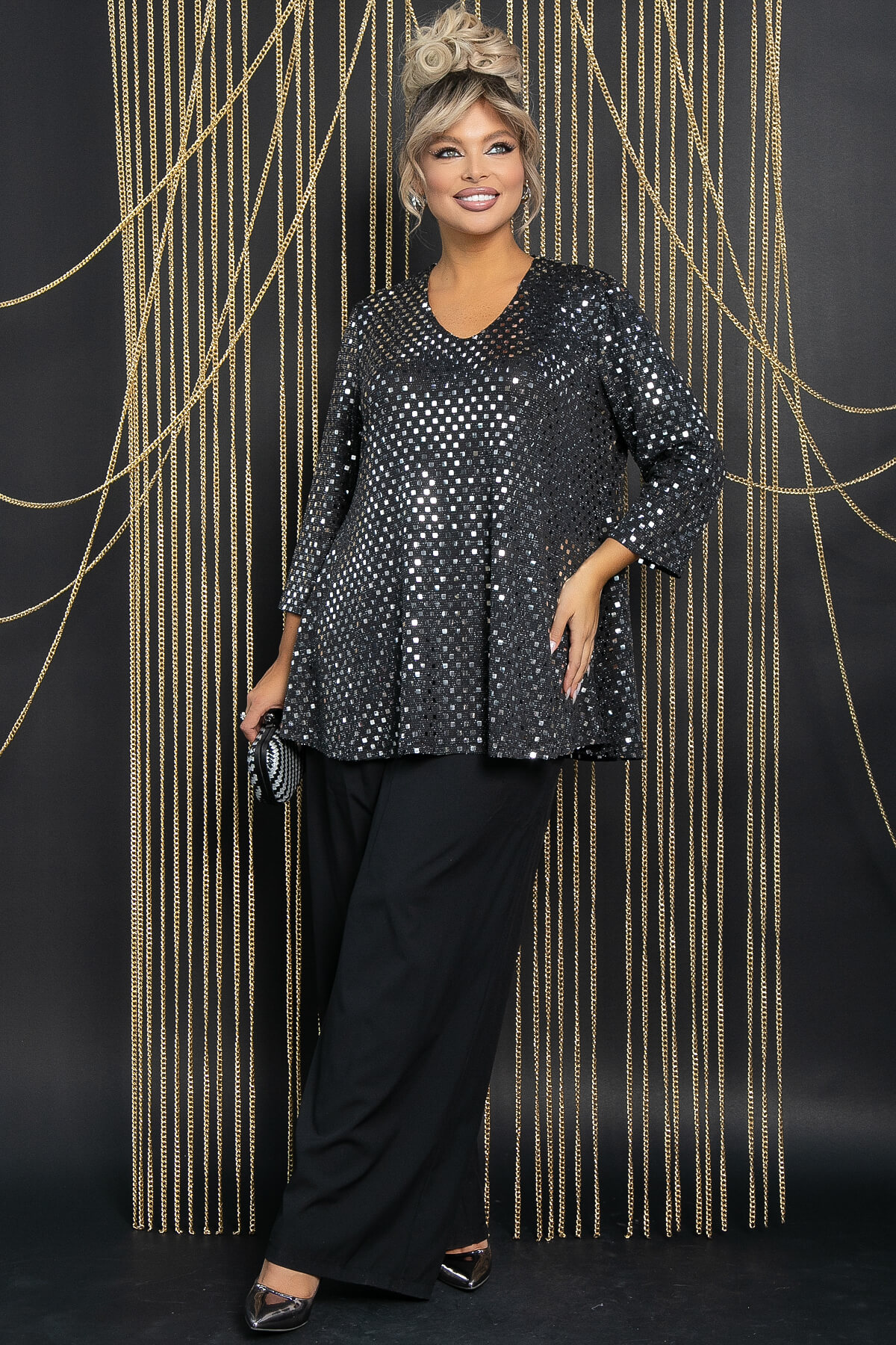 Нарядная туника свободного кроя из приятного трикотажа с пайетками. Легкая, удобная и струящаяся туника обеспечит комфорт и свободу движений. С передней стороны туника имеет красивые фалды, которые добавляют изделию особый шик. Пайетки красиво переливаются и создают ощущение праздника. Такая туника будет шикарно смотреться с брюками и позволит вам блистать на любом празднике. Создайте себе хорошее настроение и будьте самой нарядной!