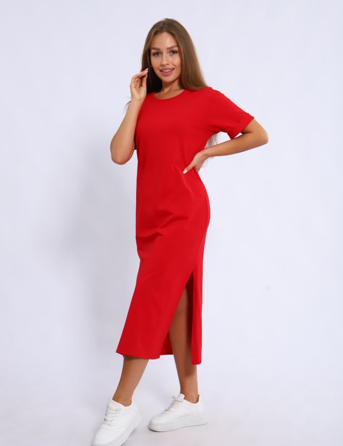 Хлопковое платье-футболка с эластаном, свободного кроя, в длине макси, горловина круглая, короткий рукав на манжете, по боковым швам разрезы. Прекрасный вариант на каждый день, подходит для любого типа фигур.