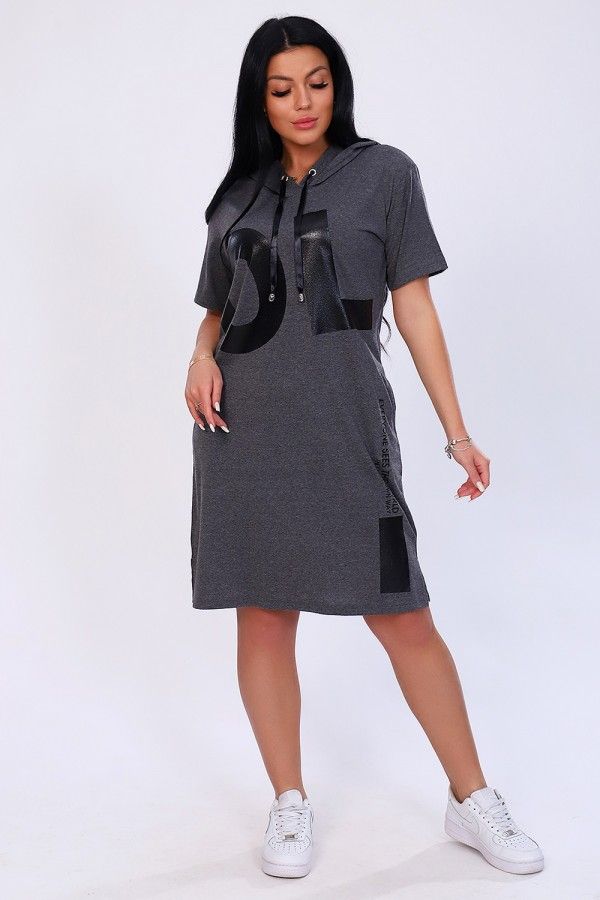 Женская туника из легкого трикотажного материала тонкого хлопка - кулирки. Свободная, спортивная, с капюшоном - её вполне можно использовать как летний вечерний костюм, как повседневный домашний наряд или как легкое праздничное или офисное платье. Благодаря свободному крою, туника отлично подойдет полным и пышным женщинам, беременным девушкам и кормящим мамам. Модный, нарядный черный принт в виде крупных и мелких латинских букв актуален всегда и придает изделию особый шик. Карманы спрятаны в боковых швах для вашего удобства.