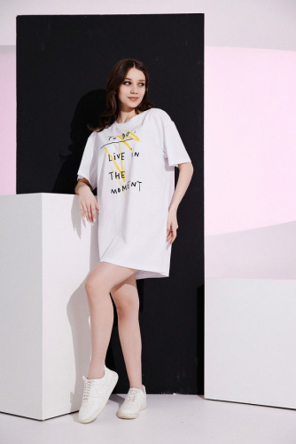 Туника прямая, свободная, с округлой горловиной, с удлиненной спинкой. Рукав короткий, с манжетом и хлястом с пуговицей. В верхней части полочки обработаны декоративные защипы. Спинка с кокеткой. В нижней части боковых швов расположены разрезы. Горловина обработана бейкой из основного полотна.
