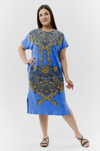 Туника женская прямого силуэта, рукав цельнокроенный короткий, в боковых швах внутренние карманы, внизу - разрезы. На полочке и спинке принт.