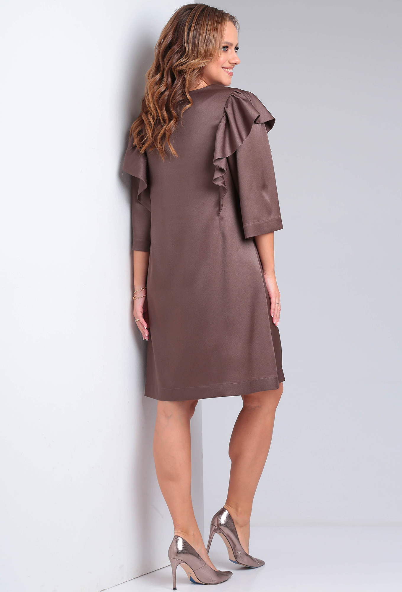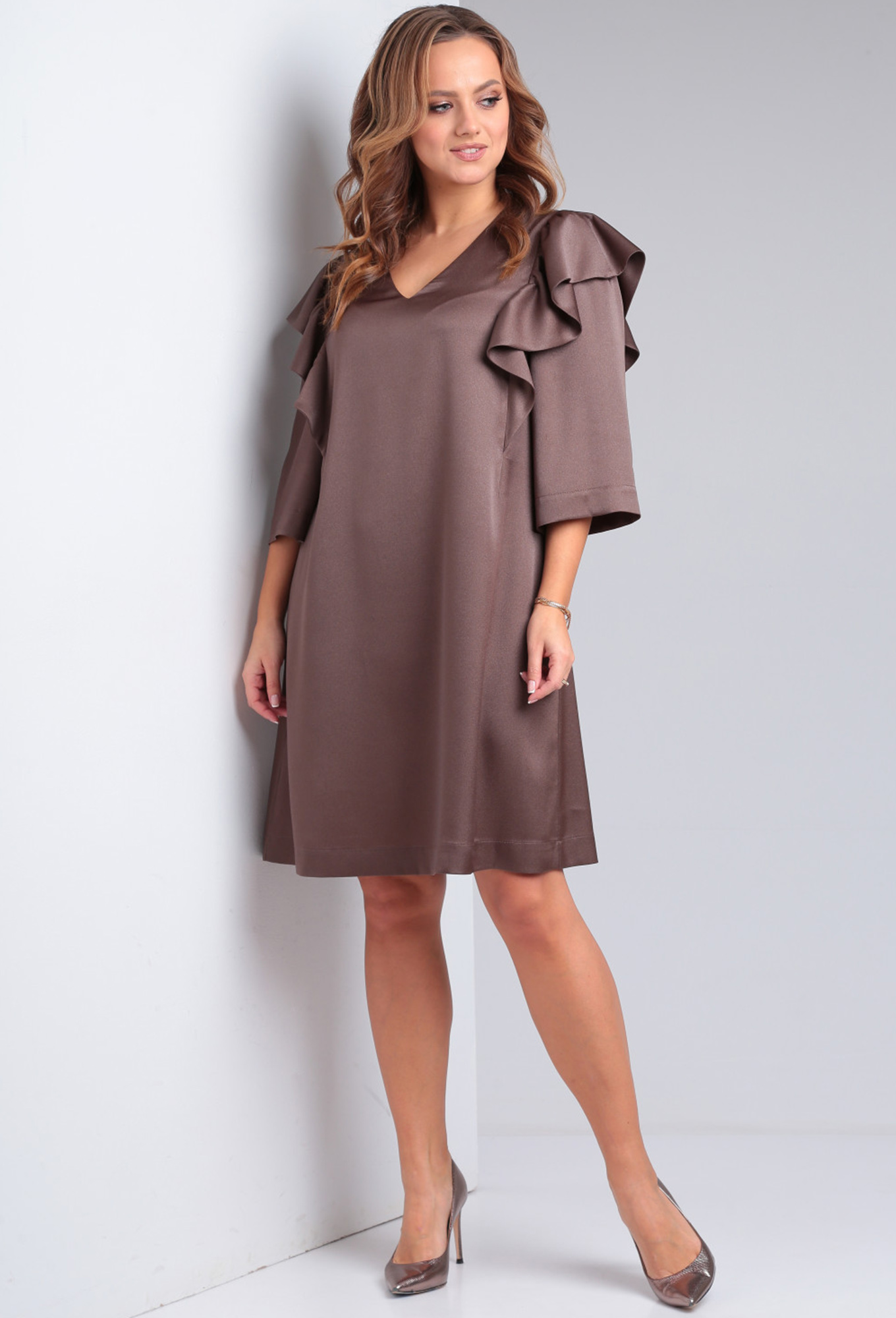 Платье женское нарядное из ткани на подкладке. По переду и спинке вертикальные рельефы декорированы воланами. Горловина V-образной формы обработана обтачкой. Рукав втачной 3/4 свободный, присобран по окату.