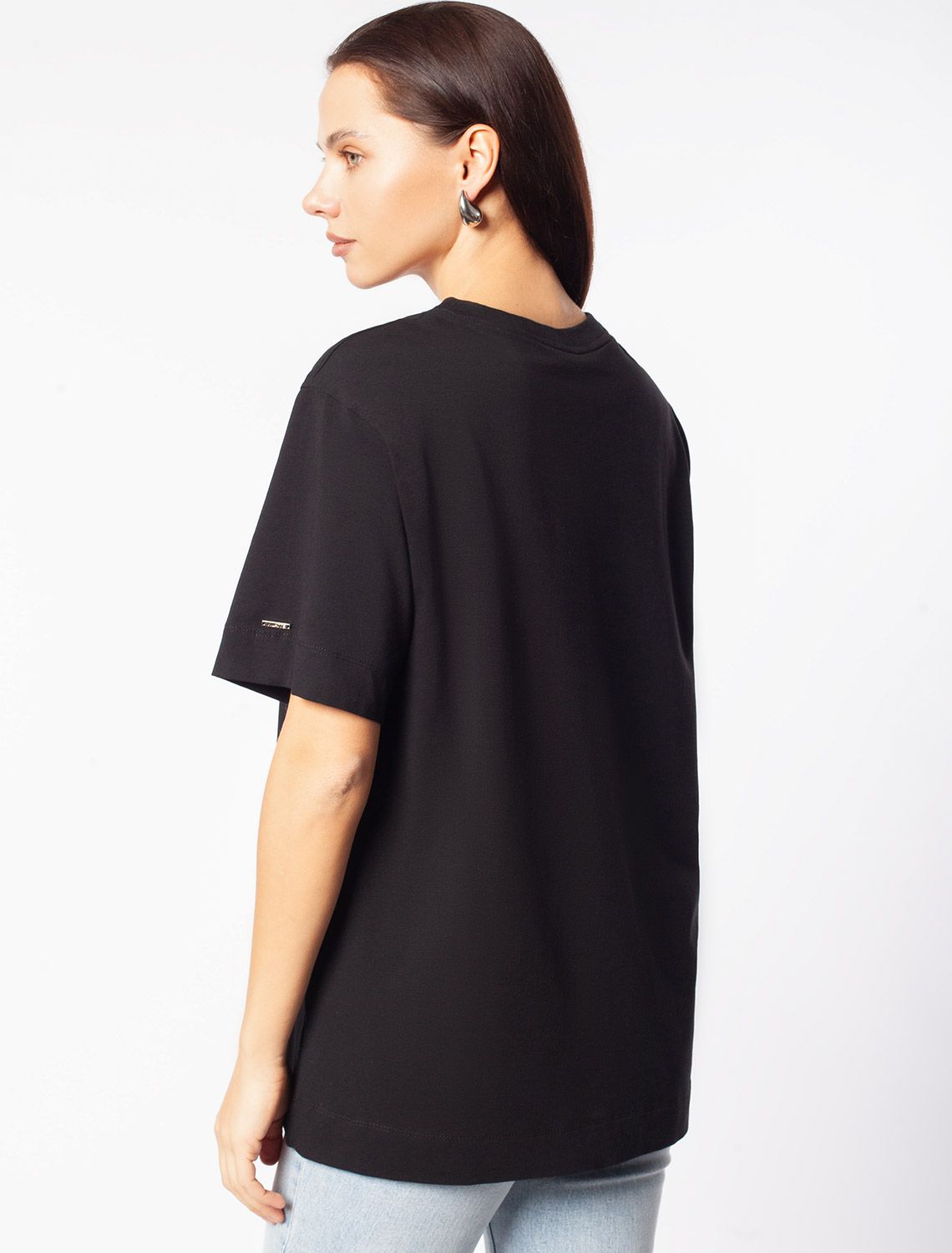 Футболка свободного кроя выполнена из премиального хлопка. Лаконичный принт нанесен красками с устойчивым покрытием и россыпью сияющих страз. Перевод: «Own your magic - Твори свою магию» Наличие эластана в составе гарантирует абсолютный комфорт и долговечность изделия. Модель дополнена металлическим логотипом бренда. черный_own your magic