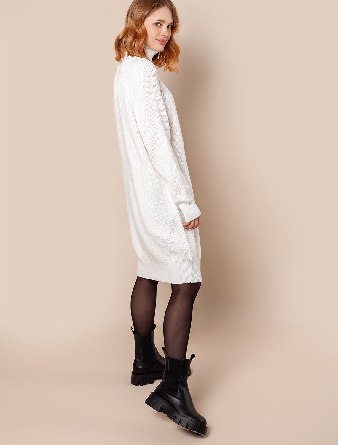 Удлиненный джемпер выполнен крупной вязкой из хлопковой пряжи с добавлением акрила. Высота воротника регулируется золотистой молнией. Свободная модель не сковывает движений, а мягкая пряжа очень приятная к телу отлично согревает в прохладное время года. Комфортная длина позволяет носить изделие как с брюками так и может быть как платье в сочетании с плотными колготками. белый