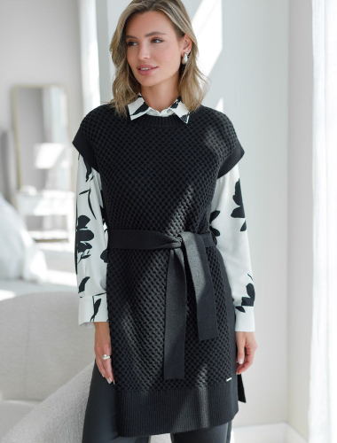 Удлиненный жилет выполнен из мягкой пряжи с кашемиром. Модель фактурной вязки дополнена высокими боковыми разрезами и поясом в тон изделия. Хорошо сочетается водолазками, лонгсливами и блузками. Мягкая пряжа очень приятная к телу, поддержит комфорт на протяжении всего дня, при этом не перегревая. Сочетается в костюме с брюками D38.013, D38.012 и юбкой D36.016 черный