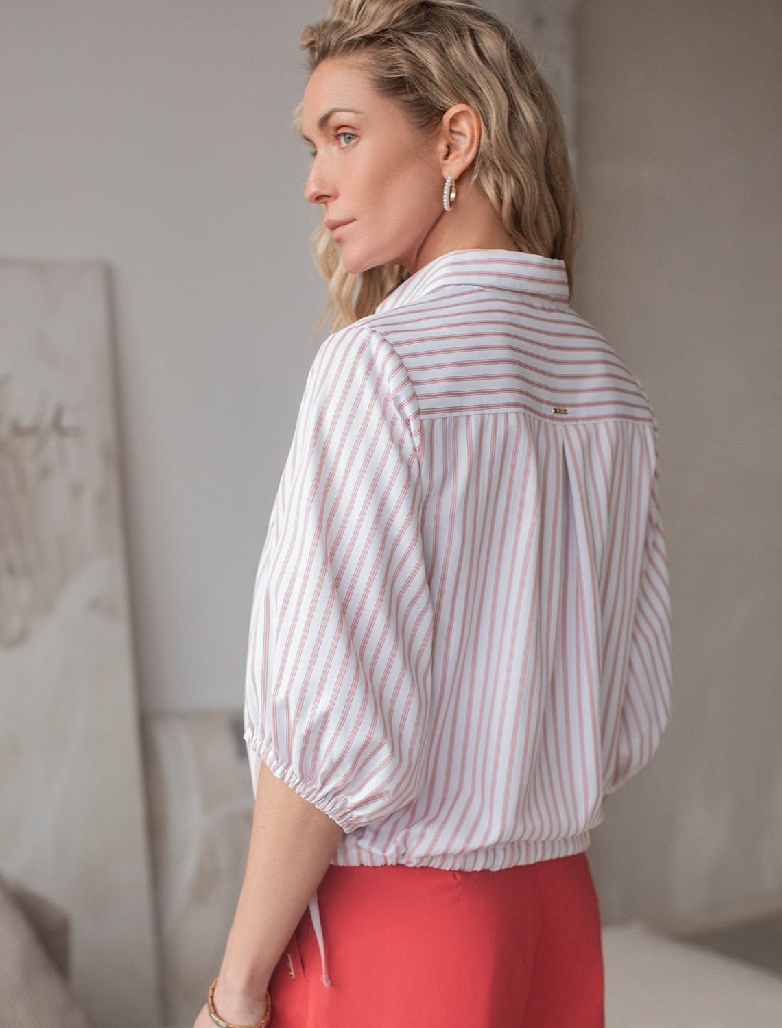 Укороченная блузка белого цвета в коралловую полоску из эластичного хлопка идеальна на весну и лето. Стильная модель с пышными рукавами буфами создает эффектный и женственный образ, который подойдет как для деловой работы, так и для повседневной носки. Практичная кулиска по низу держит форму изделия, подчеркивая талию и создавая аккуратный силуэт, а так же позволяет регулировать посадку, добавляя функциональности и удобства. Благодаря сочетанию качества материала и продуманного дизайна, рубашка хорошо сидит и на больших размерах, обеспечивая комфорт и свободу движений. Короткие рукава фонарики придают образу модный акцент, делая его более выразительным и динамичным. Натуральная ткань гарантирует комфорт и воздухопроницаемость, что особенно важно в теплое время года.