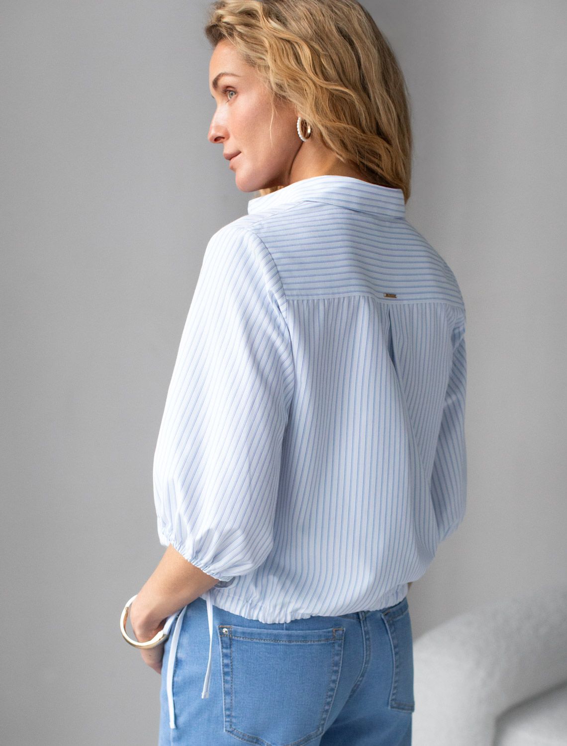 Укороченная блузка белого цвета в темно-синюю полоску из эластичного хлопка идеальна на весну и лето. Стильная модель с пышными рукавами буфами создает эффектный и женственный образ, который подойдет как для деловой работы, так и для повседневной носки. Практичная кулиска по низу держит форму изделия, подчеркивая талию и создавая аккуратный силуэт, а так же позволяет регулировать посадку, добавляя функциональности и удобства. Благодаря сочетанию качества материала и продуманного дизайна, рубашка хорошо сидит и на больших размерах, обеспечивая комфорт и свободу движений. Короткие рукава фонарики придают образу модный акцент, делая его более выразительным и динамичным. Натуральная ткань гарантирует комфорт и воздухопроницаемость, что особенно важно в теплое время года.