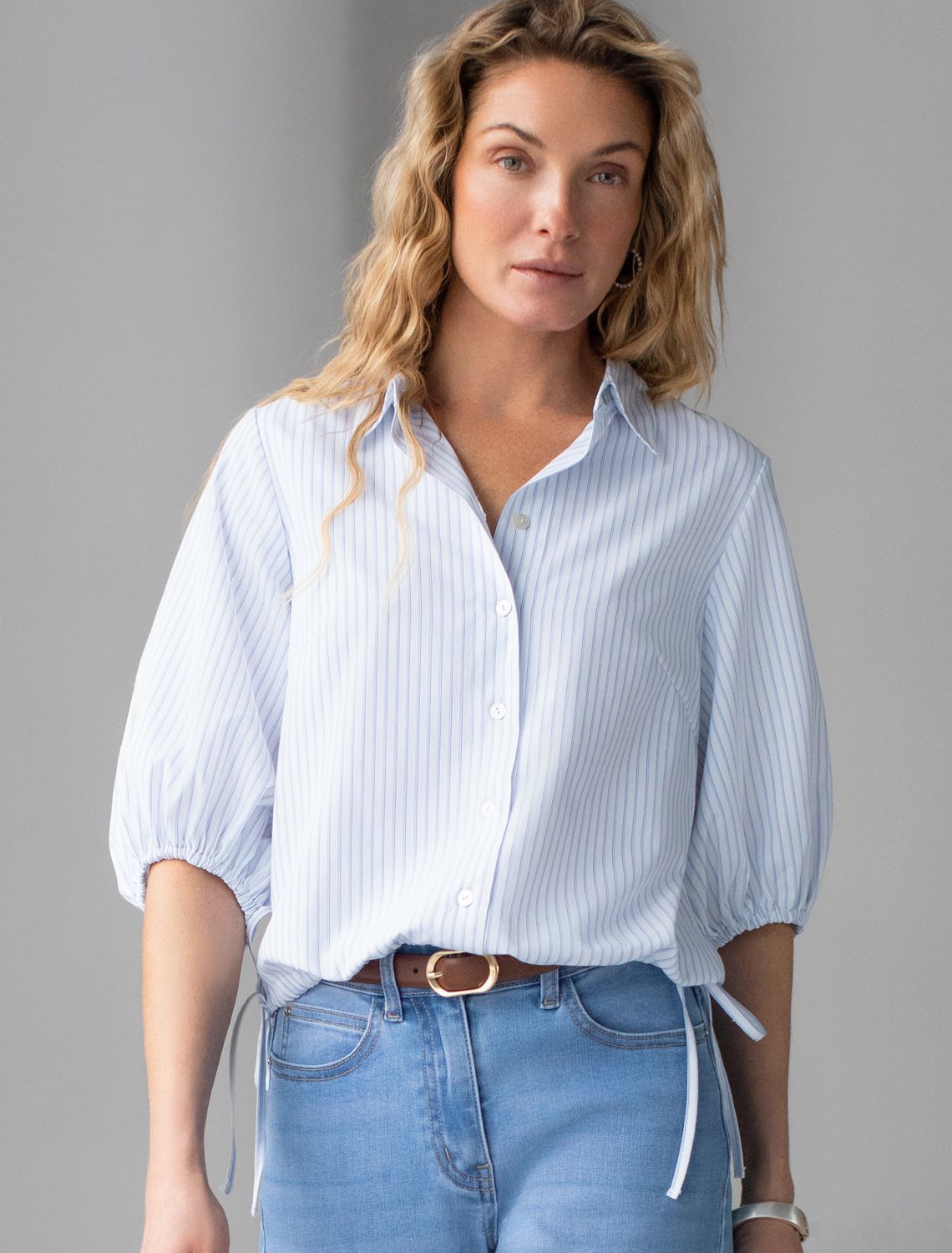 Укороченная блузка белого цвета в темно-синюю полоску из хлопка идеальна на весну и лето. Такой вид полосатой ткани называется пестротканой — полосы созданы переплетением нитей разных цветов. Смешанный состав ткани идеален для деловых блузок: хлопок приятен к телу, полиэстер повышает долговечность. Стильная модель с пышными рукавами буфами создает эффектный и женственный образ, который подойдет как для деловой работы, так и для повседневной носки. Блузка дополнена пуговицами из натурального перламутра — это экологичная долговечная фурнитура с уникальным сиянием. Практичная кулиска по низу держит форму изделия, подчеркивая талию и создавая аккуратный силуэт, а так же позволяет регулировать посадку, добавляя функциональности и удобства. Благодаря сочетанию качества материала и продуманного дизайна, рубашка хорошо сидит и на больших размерах, обеспечивая комфорт и свободу движений. Короткие рукава фонарики придают образу модный акцент, делая его более выразительным и динамичным. Натуральная ткань гарантирует комфорт и воздухопроницаемость, что особенно важно в теплое время года. белый-темно-синий