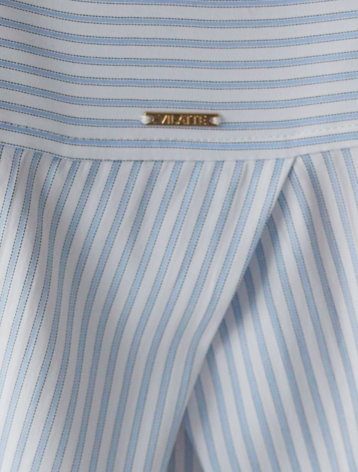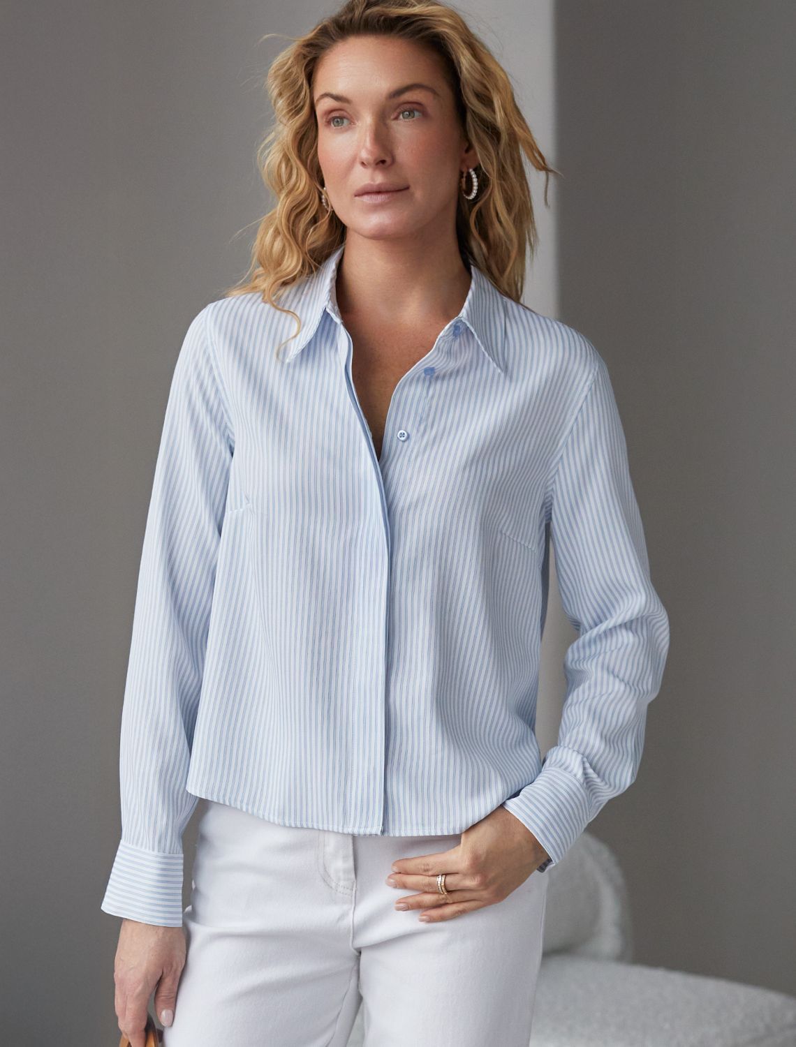 Стильная укороченная блузка белого цвета в голубую полоску создана для комфорта в любой ситуации. Хлопок делает модель приятной для тела и хорошо дышащей, что особенно важно в течение долгого дня. Свободный крой не ограничивает движения, подходит на любую фигуру и гармонично смотрится в разных образах. Всегда актуальный принт в полоску визуально вытягивает и стройнит фигуру, добавляет образу динамики, делая блузку эффектным акцентом в гардеробе. Повседневная блузка держит форму даже после продолжительной носки, что помогает всегда выглядеть аккуратно. На спинке выполнена декоративная складка, придающая дополнительный объем и интересный силуэт. Отложной воротник придает классический вид,, подходящий для офисных будней. Особенно стильно рубашка смотрится в непринужденных, городских или повседневных комплектах. белый-голубой