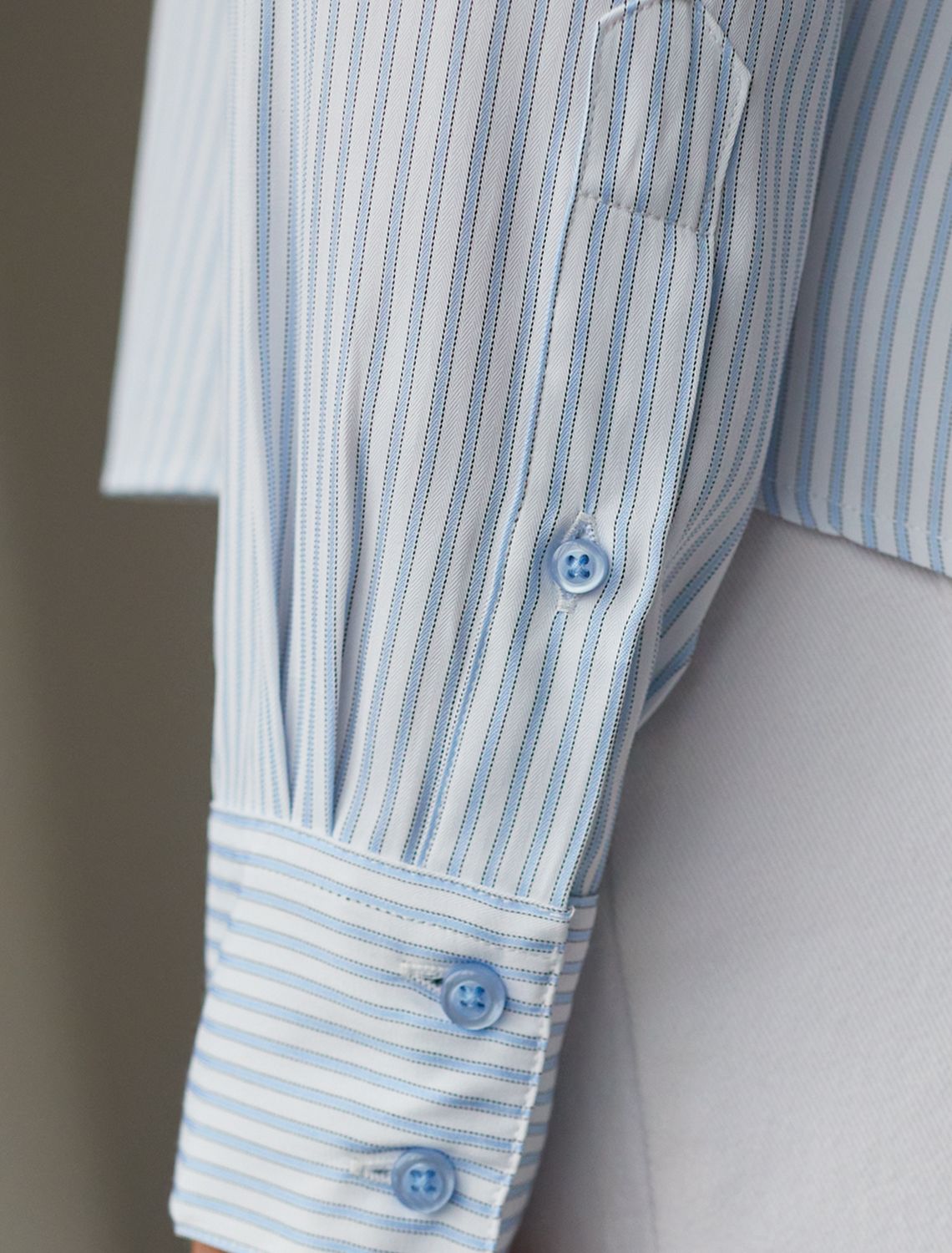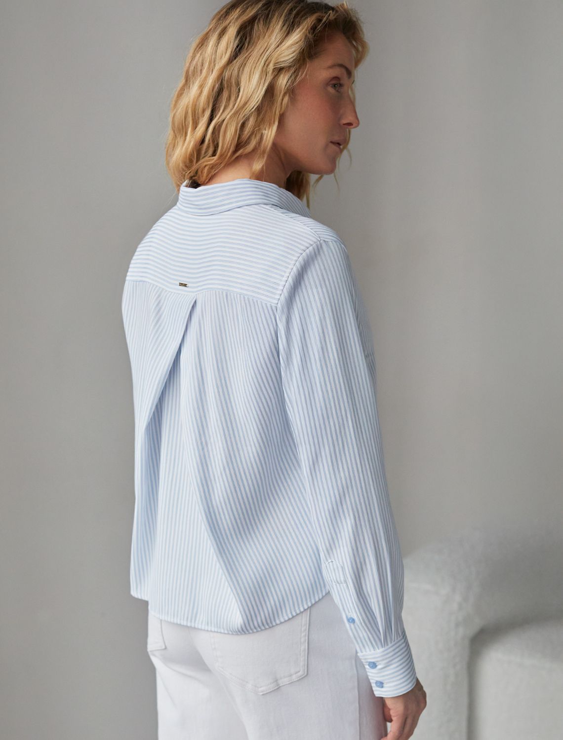 Стильная укороченная блузка белого цвета в голубую полоску создана для комфорта в любой ситуации. Хлопок делает модель приятной для тела и хорошо дышащей, что особенно важно в течение долгого дня. Свободный крой не ограничивает движения, подходит на любую фигуру и гармонично смотрится в разных образах. Всегда актуальный принт в полоску визуально вытягивает и стройнит фигуру, добавляет образу динамики, делая блузку эффектным акцентом в гардеробе. Повседневная блузка держит форму даже после продолжительной носки, что помогает всегда выглядеть аккуратно. На спинке блузки расположена встречная бантовая складка с наклоном, что создаёт красивый визуальный эффект и придаёт дополнительный объем. Рукава обработаны широким манжетом на 2 пуговицы. Дополнительная пуговица на планке рукава не даёт раскрываться и топорщиться разрезу. Отложной воротник придает классический вид,, подходящий для офисных будней. Особенно стильно рубашка смотрится в непринужденных, городских или повседневных комплектах. белый-голубой