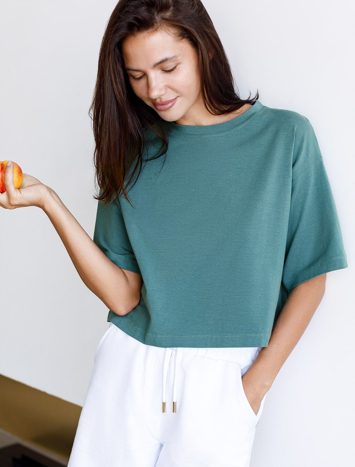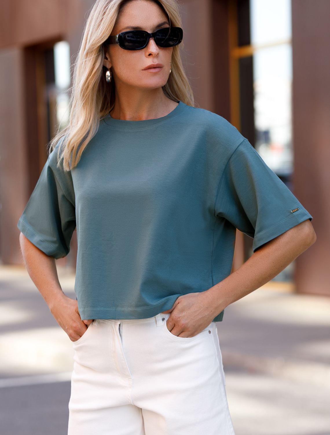 Укороченная футболка силуэта over-size сшита из премиального хлопка. Трендовый укороченный силуэт и базовая любимая вещь, которую можно носить не один сезон. Круглая горловина выполнена из эластичной рибаны. Ткань содержит небольшое количество эластана, за счет чего слегка тянется и не сковывает движения. На рукаве фирменный металлический логотип бренда. Сочетайте с брюками и юбками с высокой посадкой. Идеально на выпуск в жаркие дни. полынь