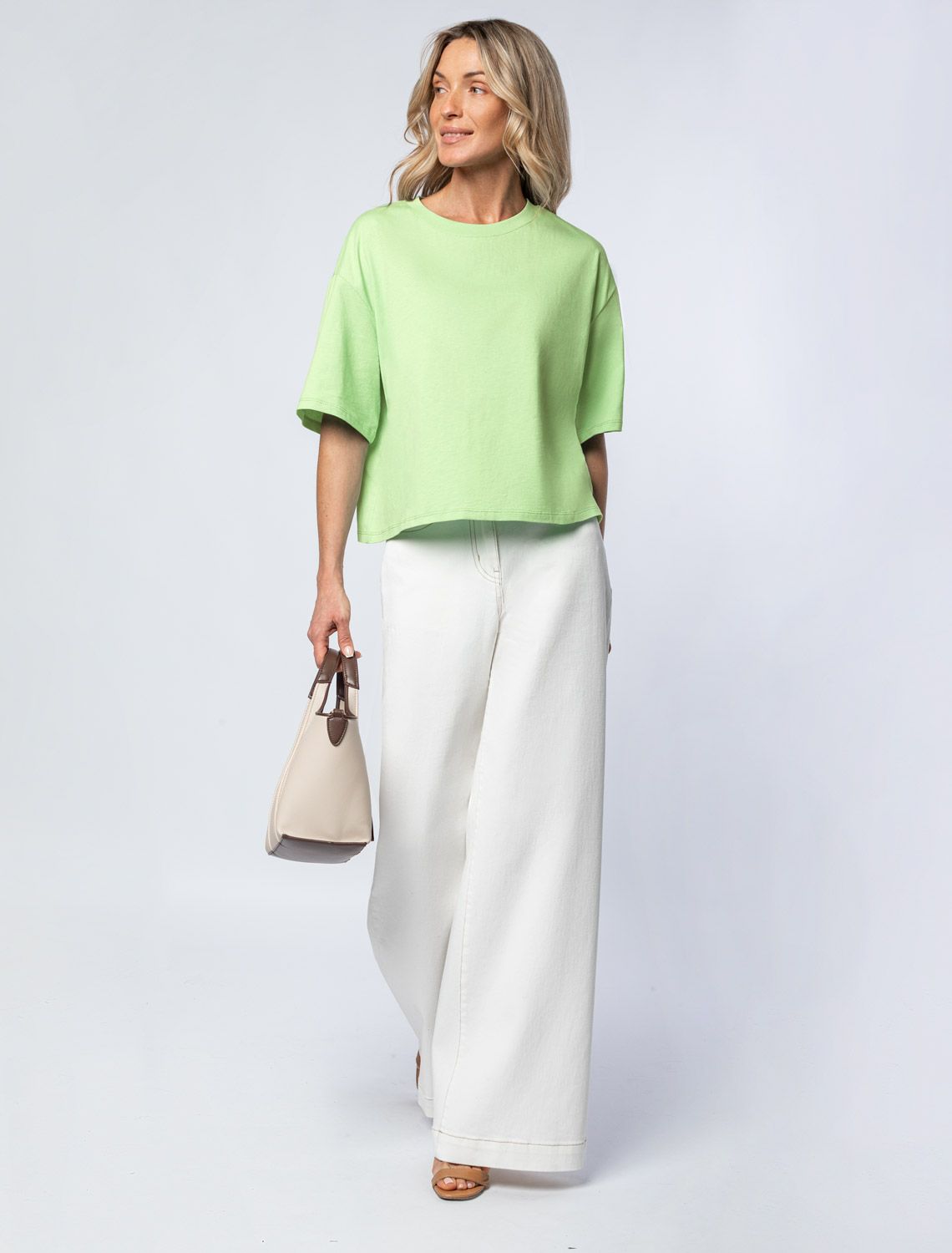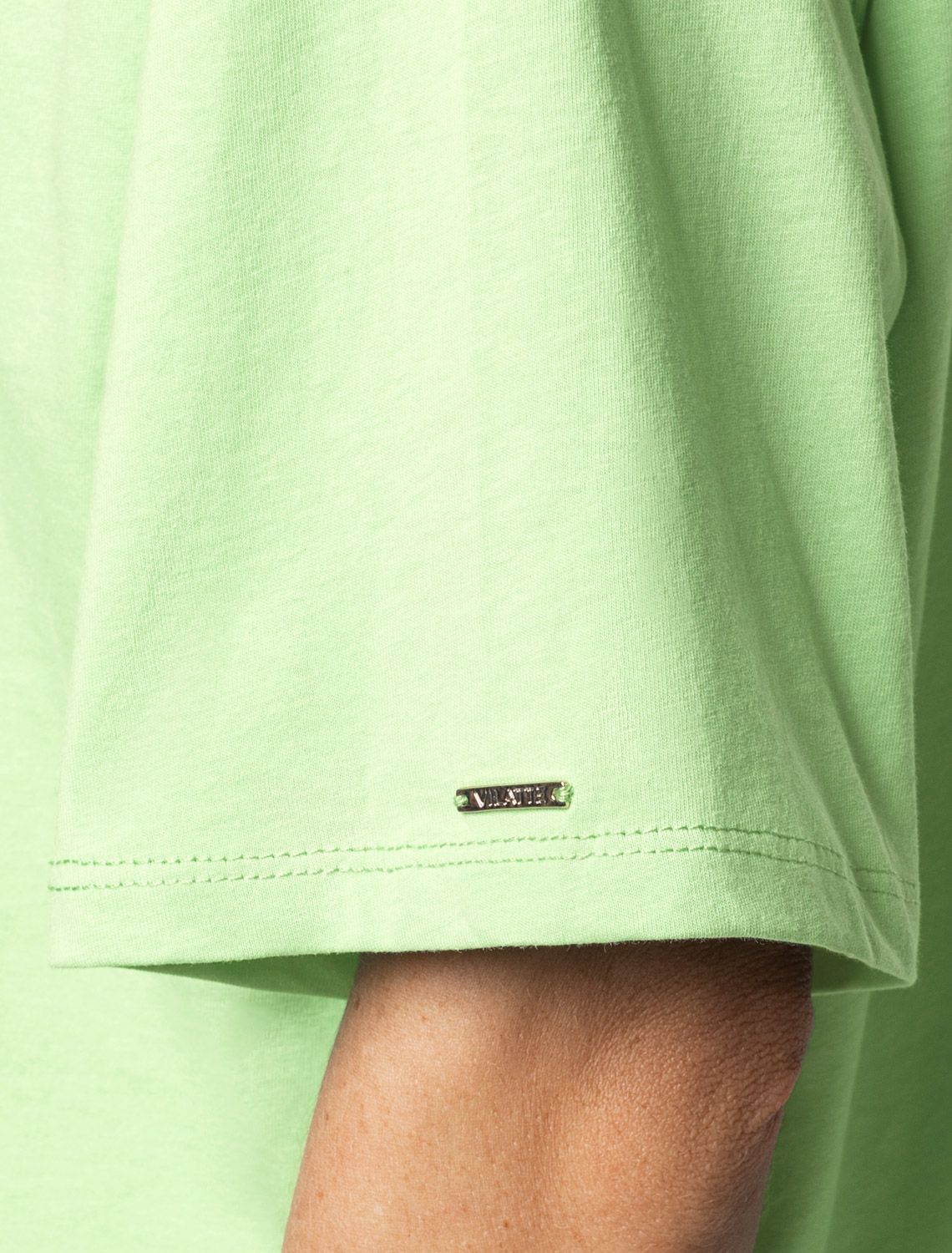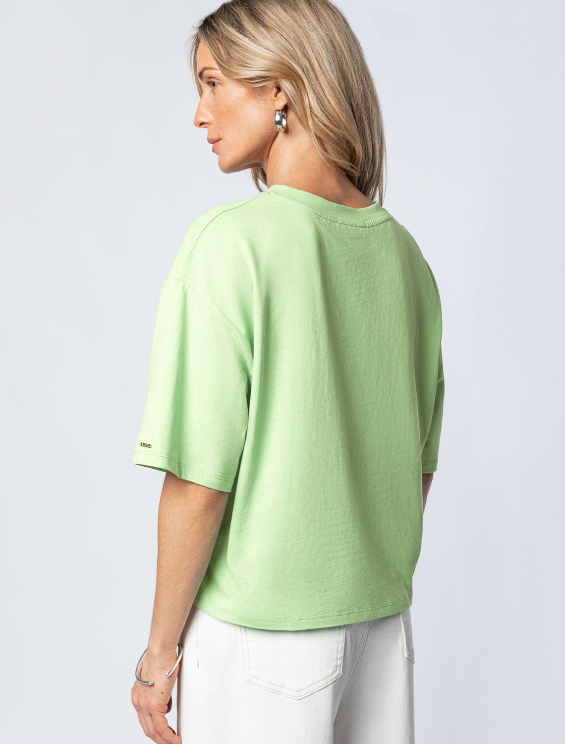 Базовая футболка из 100% хлопка. Укороченная модель свободной посадки идеально впишется в повседненвый гардероб. Изделие хорошо держит форму и обеспечивает комфортный микроклимат в течение дня. фисташковый