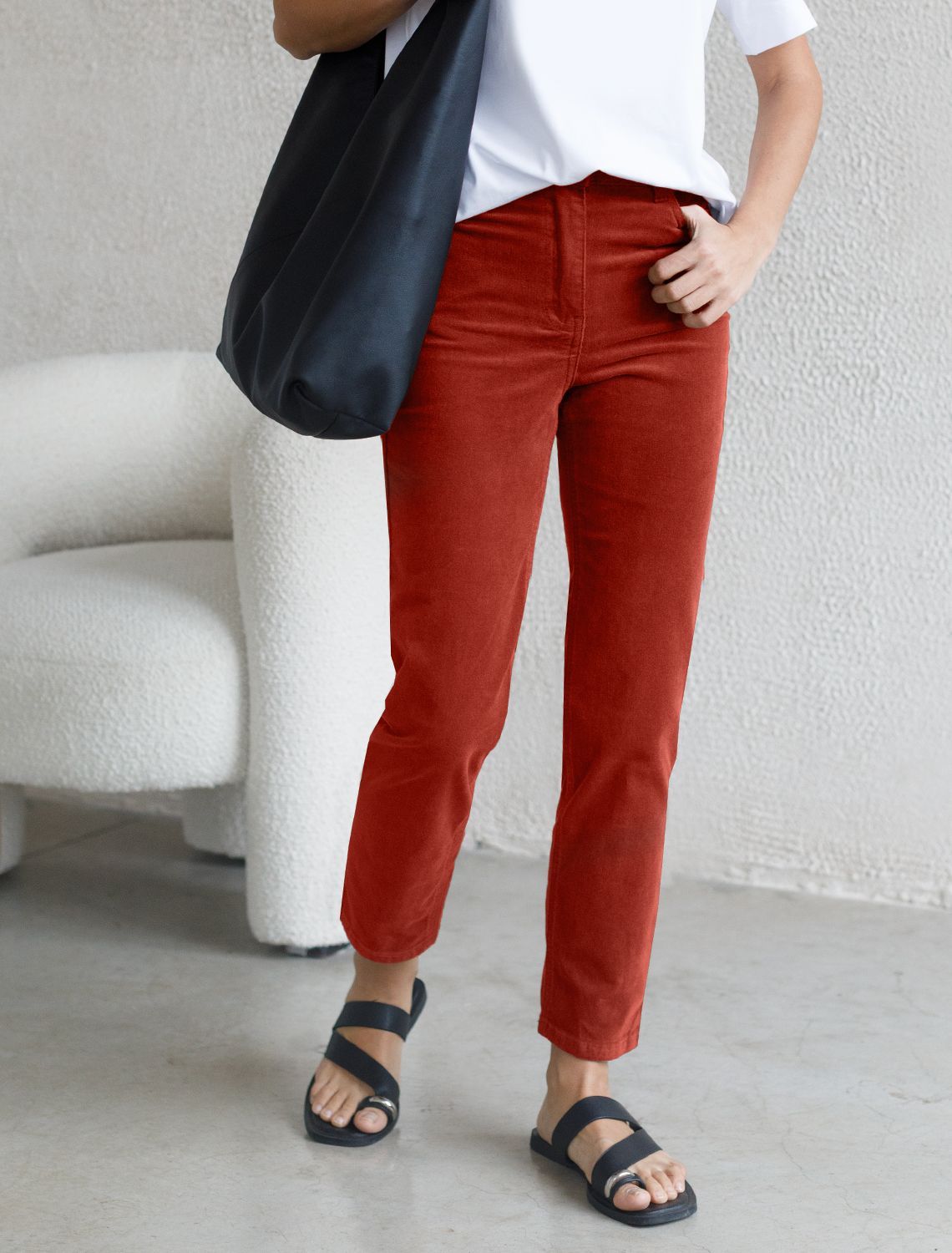 Брюки скроют недостатки фигуры, вытягивают силуэт и удлиняют ноги, благодаря завышенной талии. Пять карманов, как у джинс, добавляют функциональности, а высококачественная фурнитура гарантирует надёжность. Актуальная однотонная расцветка позволит легко комбинировать штаны с другими вещами из гардероба. Брюки джинсы хорошо комбинируется с вязаным трикотажем, блузками и денимом. Как альтернатива классическим брюкам, в нестрогий офисный дресс-код. терракотовый