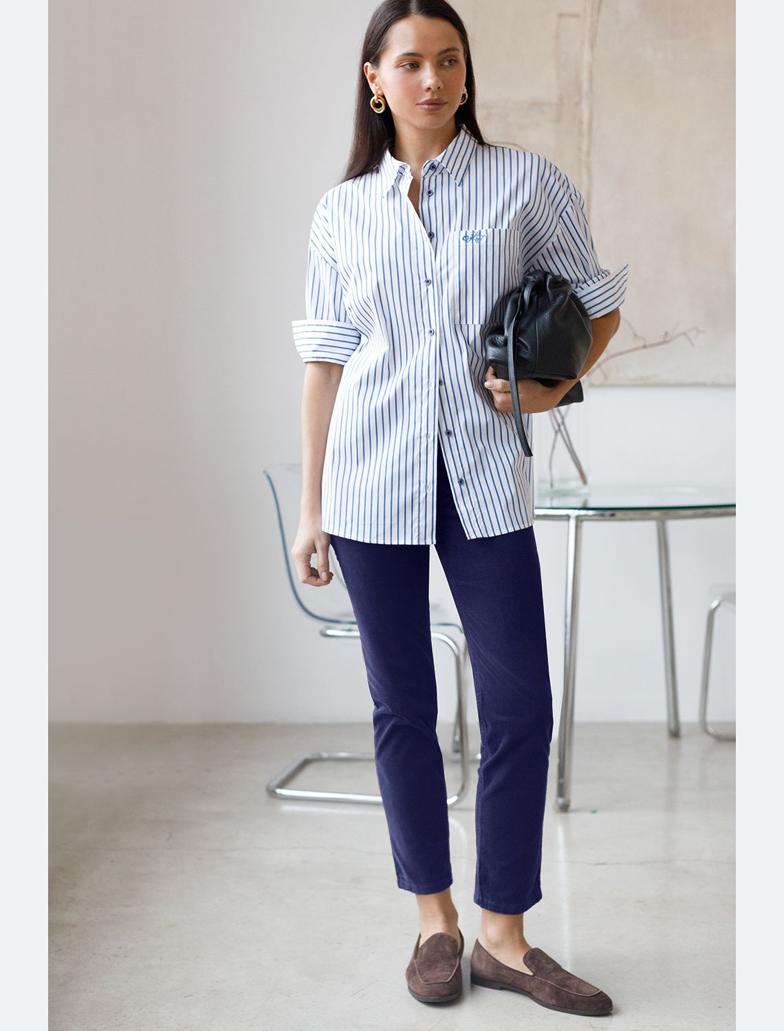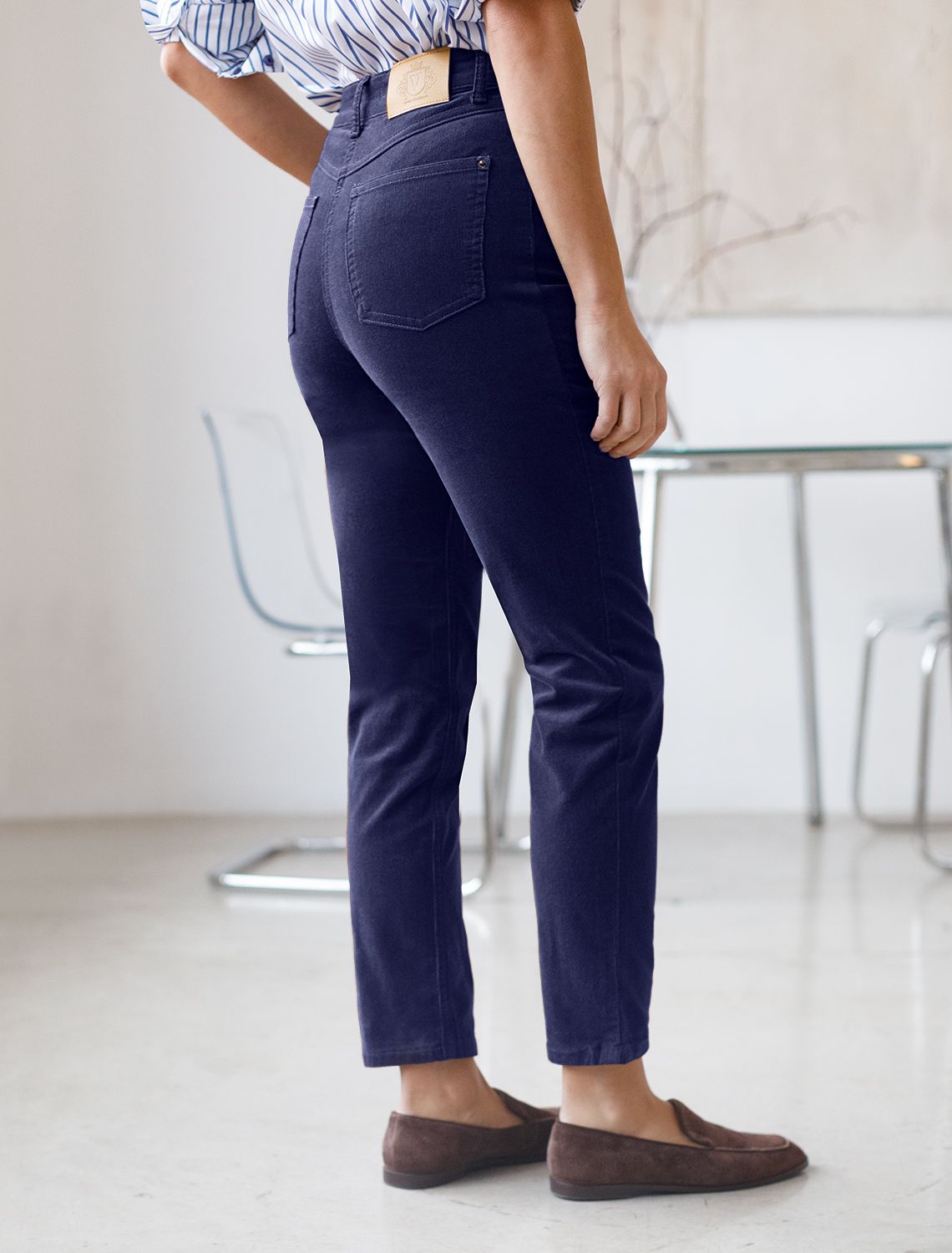 Брюки скроют недостатки фигуры, вытягивают силуэт и удлиняют ноги, благодаря завышенной талии. Пять карманов, как у джинс, добавляют функциональности, а высококачественная фурнитура гарантирует надёжность. Актуальная однотонная расцветка позволит легко комбинировать штаны с другими вещами из гардероба. Брюки джинсы хорошо комбинируется с вязаным трикотажем, блузками и денимом. Как альтернатива классическим брюкам, в нестрогий офисный дресс-код. синий