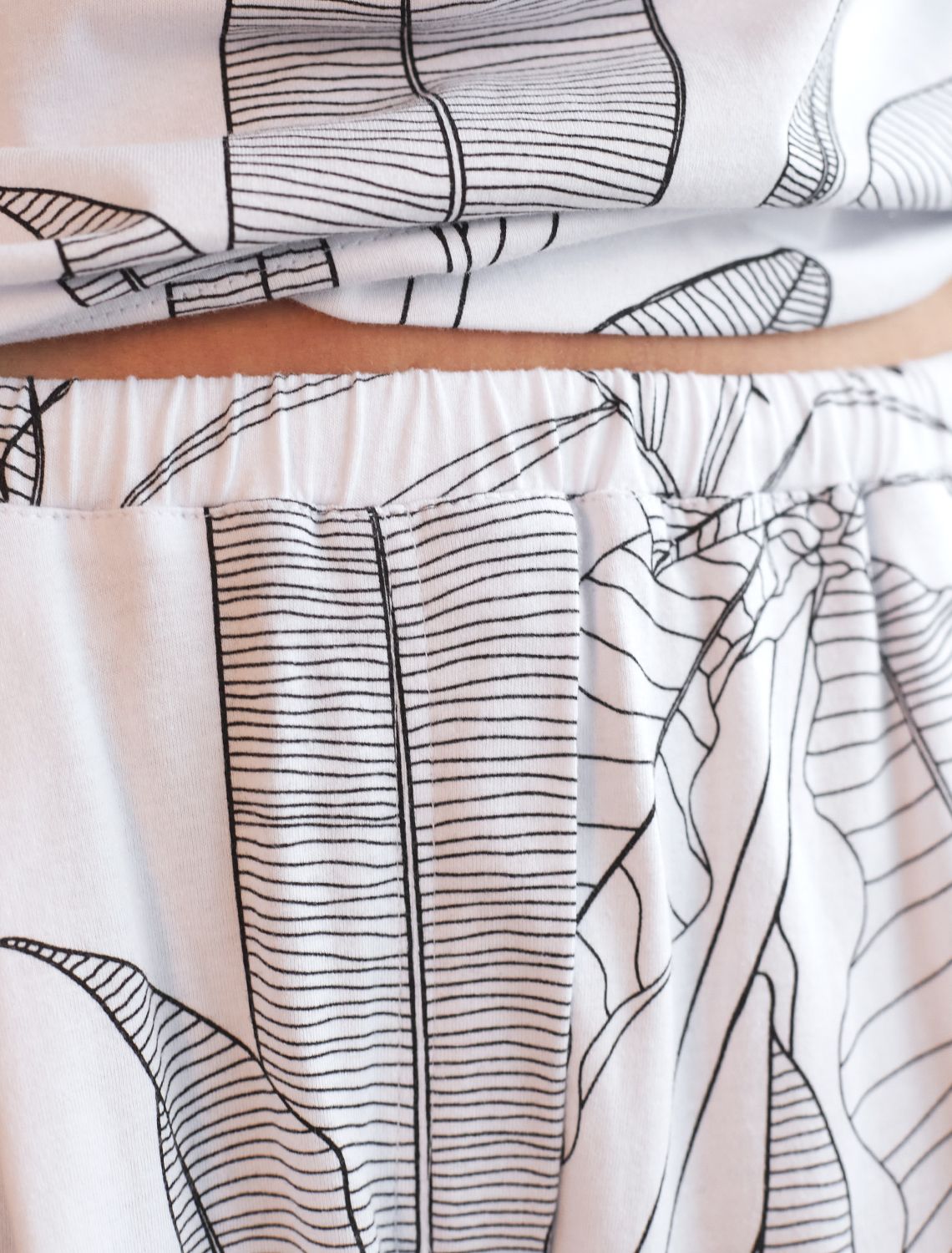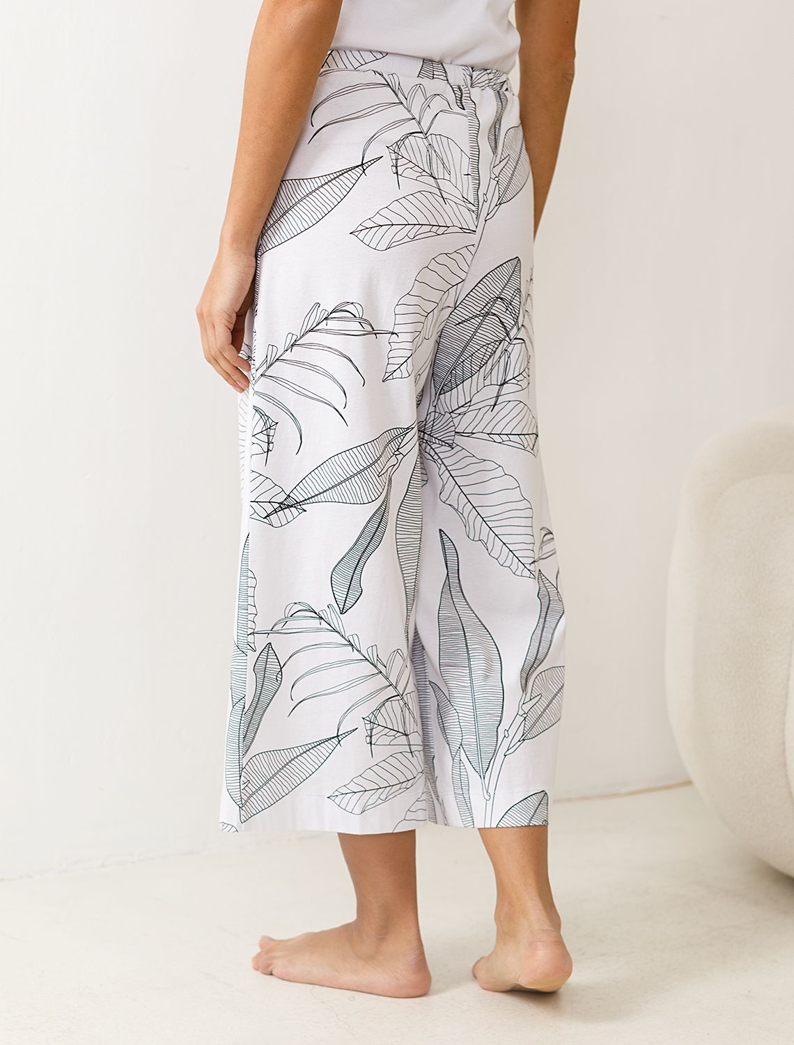 Укороченные широкие брюки кюлоты c принтом на резинке из 100% хлопка D44.162 белый-черный листья