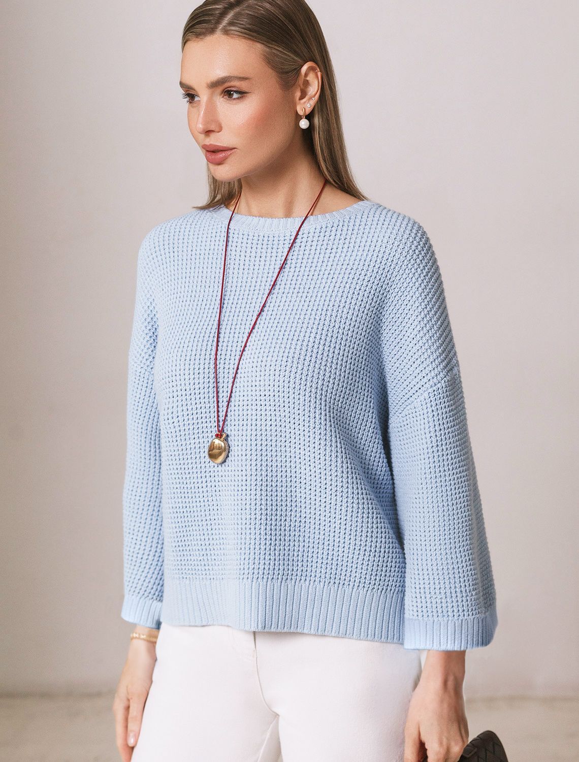 60%Хлопок 40%ПАН (акрил) Стильный укороченный джемпер светло-голубого цвета создан для тех, кто ценит современный образ и комфорт. Свободный крой подчеркивает легкость и позволяет чувствовать себя уютно в любой ситуации. Рельефная вязка в виде оригинального узора "шашечки" добавляет джемперу выразительности. Благодаря натуральному хлопку повседневный джемпер обеспечивает комфорт даже в жаркие дни: хлопок позволяет коже дышать и поддерживает оптимальный микроклимат. А акрил в составе придает мягкость, отличную цветостойкость, а также гипоаллергенность и устойчивость к деформации, что делает джемпер легким в уходе. Круглый ворот и спущенная линия плеча добавляют образу аккуратности и расслабленности. Широкие рукава создают воздушность и делают силуэт особенно женственным. Такой джемпер легко сочетать с широкими и узкими низами для создания повседневного или более нарядного ансамбля. Джемпер отлично подойдет для прохладных весенних и летних дней благодаря плотности материала, а также станет удачным решением для многослойных луков. Вязка подчеркивает индивидуальность вещи и привлекает внимание к деталям вашего стиля.