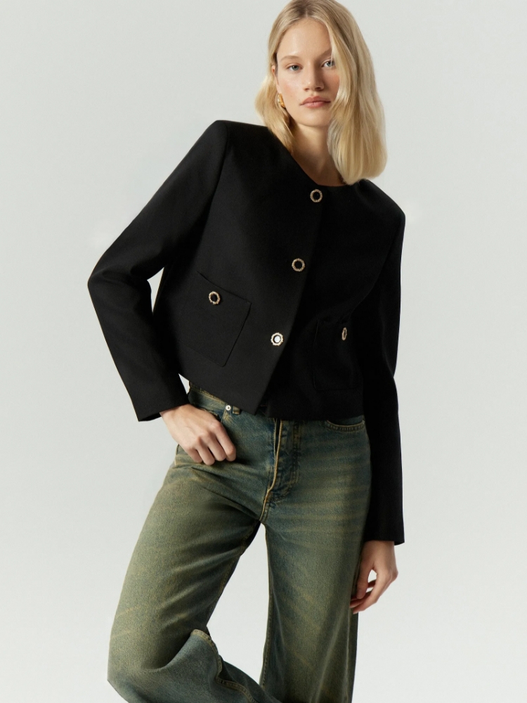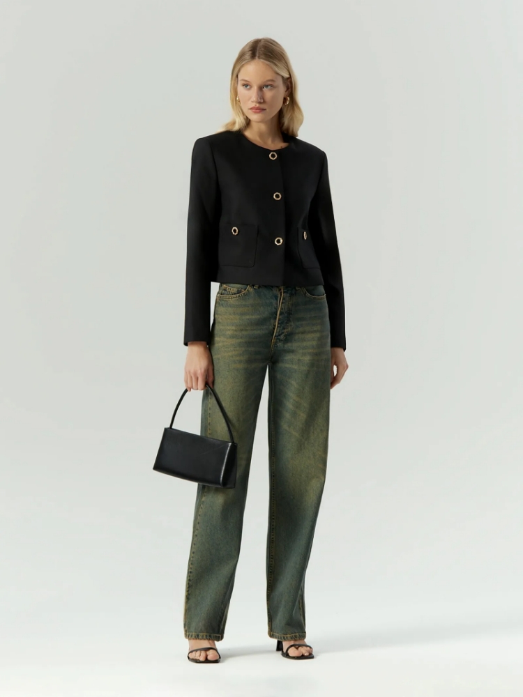 Чёрный жакет на каждый день и не только. Модель в стиле Шанель с акцентной фурнитурой внесёт идеальный баланс сдержанности, романтичности и лёгкости в деловой гардероб. Завершить образ можно брюками из комплекта. Изделие выполнено на подкладке