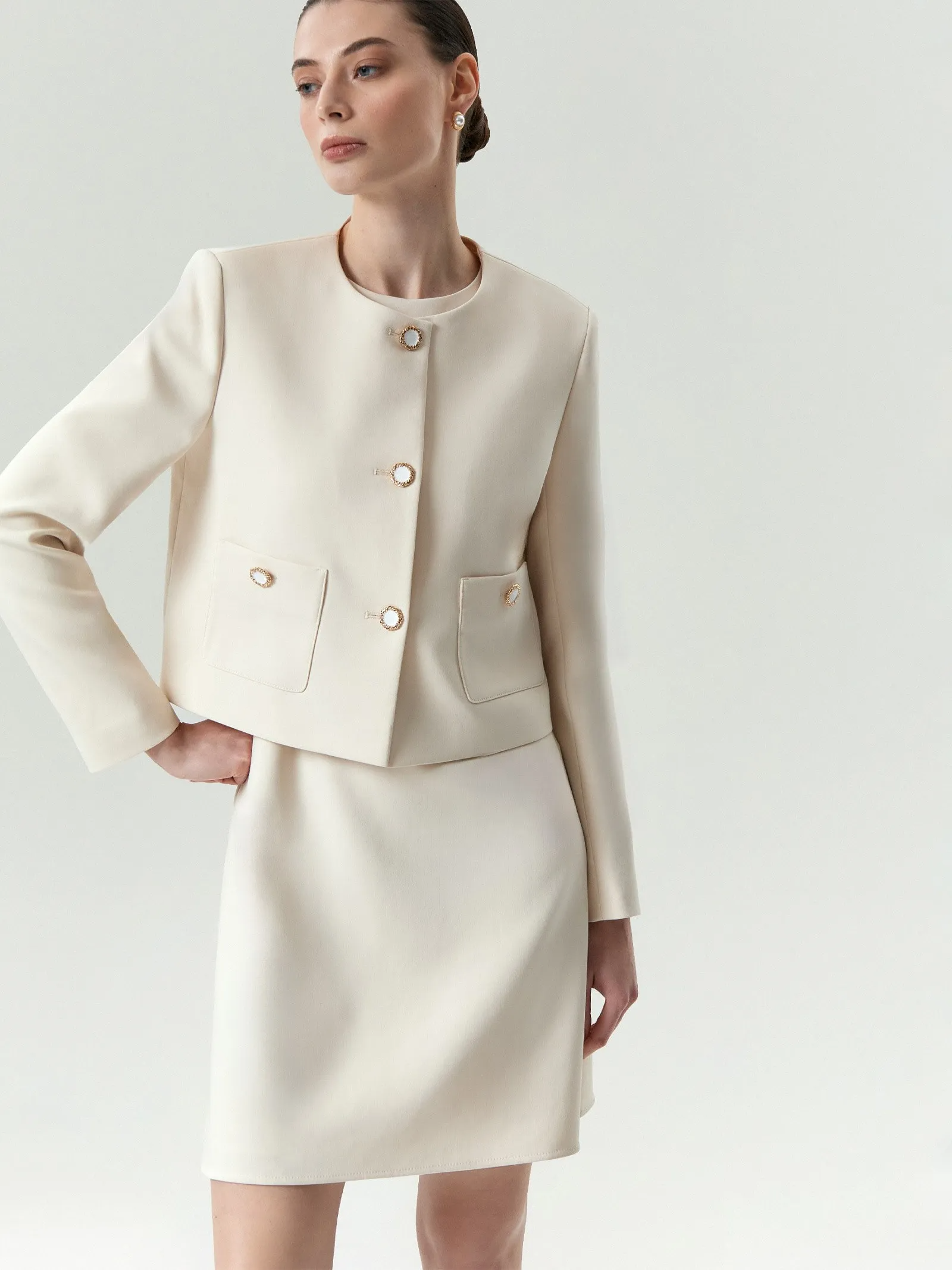 Молочный жакет на каждый день и не только. Изюминкой вещи стали элегантные пуговицы с изящным орнаментом. Модель в стиле Шанель с акцентной фурнитурой внесёт идеальный баланс сдержанности, романтичности и лёгкости в деловой гардероб. Завершить образ можно платьем из комплекта. Изделие выполнено на подкладке.