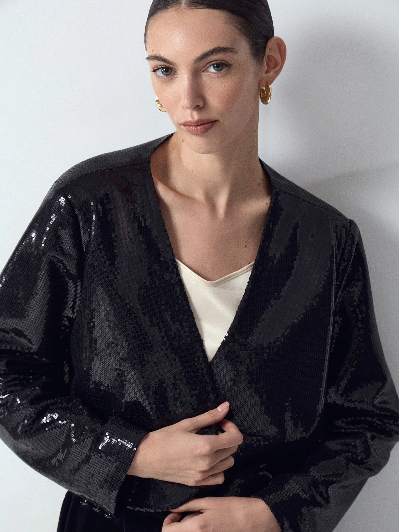 Жакет-болеро из чёрных пайеток — отличный вариант верха для образов с платьями-комбинациями, топами, юбками, в том числе пышными. Пайетки создают гипнотизирующее впечатление текучей гладкости. На рукавах ещё один красивый акцент: декоративная фурнитура с чеканкой. Модель без лацканов и пуговиц воплощает актуальные тренды сезона. Изделие застегивается на крючок внизу, выполнено на подкладке.