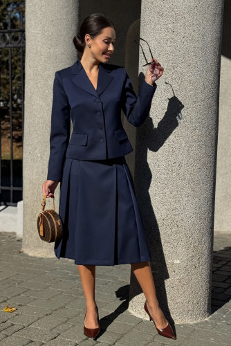 Нет ничего прекраснее, чем женский костюм с вышивкой. Этот красивый костюм придаст вашему образу утонченности и изящества. Костюм женский двухпредметный из костюмно-плательной ткани, состоит из платья-футляр с коротким рукавом на подкладке и жакета без застежки на подкладке с декоративной вышивкой и отделочным кантом. Жакет женский прямой с рукавом реглан, без застежки с отделочным кантом и декоративной вышивкой. Перед с нагрудной вытачкой, выходящей из рельефного шва, идущего от проймы до низа. Спинка со средним швом. Горловина круглой формы, обработана воротником-стойкой. Рукав реглан, двухшовный с разрезом Платье женское полуприлегающего силуэта на трикотажной подкладке. Перед с рельефными швами, выходящим из проймы до горизонтального подреза на уровне линии талии с кантом. Нижняя часть переда платья с талиевыми вытачками, идущими на продолжение рельефных швов. Спинка платья с талиевыми вытачками и средним швом, в котором обработана застежка на потайную тесьму-молнию и разрезом. Горловина круглой формы, обработана подкладкой. Рукава втачные одношовные, короткие. Длина жакета по среднему шву спинки -59 см, длина платья по среднему шву спинки - 106 см