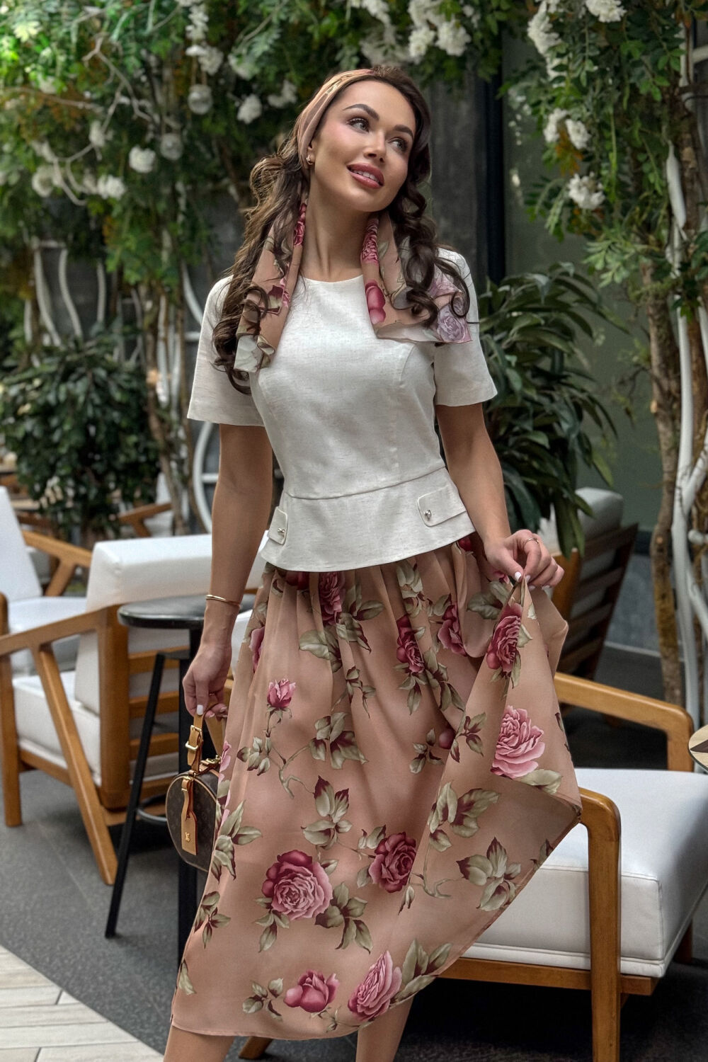 Состав: Блуза- Вискоза-32%; ПЭ-39%; Лён-29%; Юбка- ПЭ-100%;