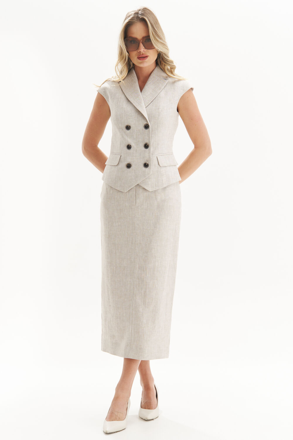 Элегантный костюм из натурального льна — идеальный выбор для теплого сезона. Комплект состоит из приталенного жилета с эффектной двубортной застежкой и прямой юбки миди-длины. Лёгкий оттенок натурального льна делает образ утонченным и универсальным, а современный крой подчеркивает фигуру, сохраняя свободу движений.