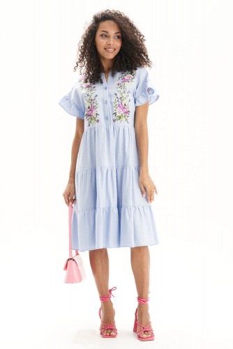 Юбка прямого силуэта, зауженная к низу, на притачном поясе, с застежкой на 1 петлю и 1 пуговицу, без подкладки Переднее полотнище с талиевыми вытачками, с центральным швом, в верхней части с имитацией застежки. Заднее полотнище с талиевыми вытачками и средним швом, в верхней части которого обработана застежка на потайную тесьму - молнию, в нижней – шлица. В размерах 50,52 в поясе, на уровне боковых швов предусмотрена резинка.