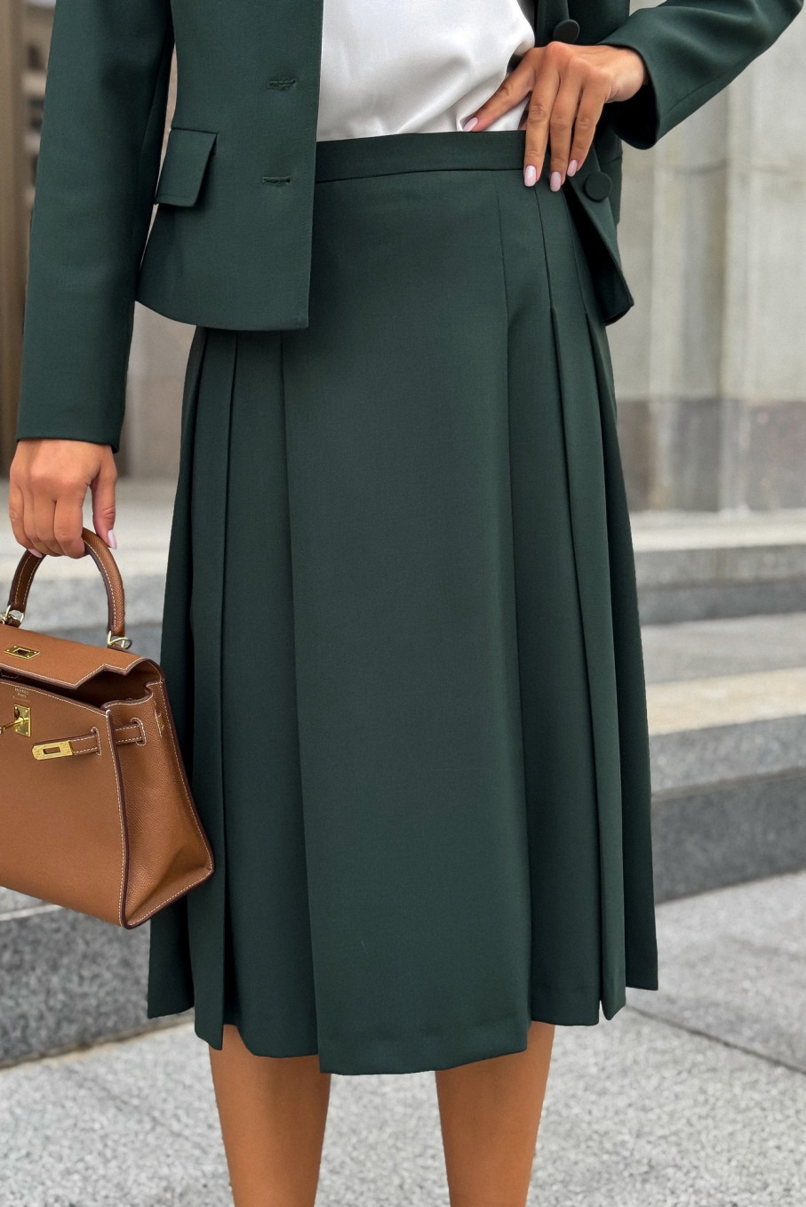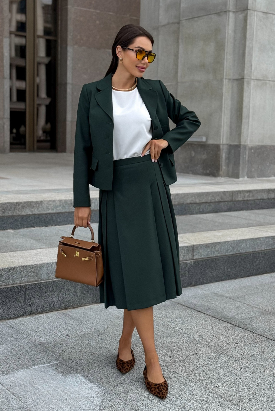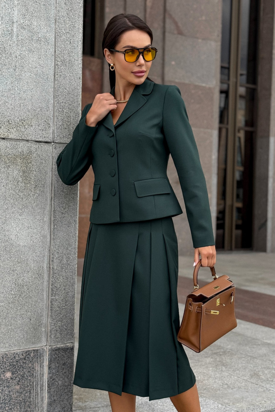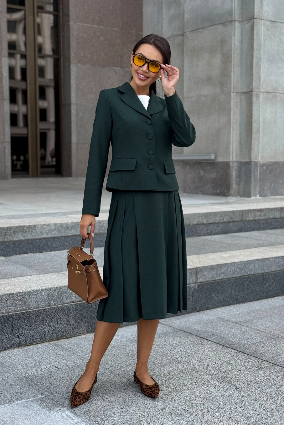 Благородный зелёный оттенок выгодно выделяет образ, подчеркивает женственность и создаёт гармоничный силуэт. Дополните костюм классическими лодочками или элегантными аксессуарами, чтобы завершить стильный и уверенный look.