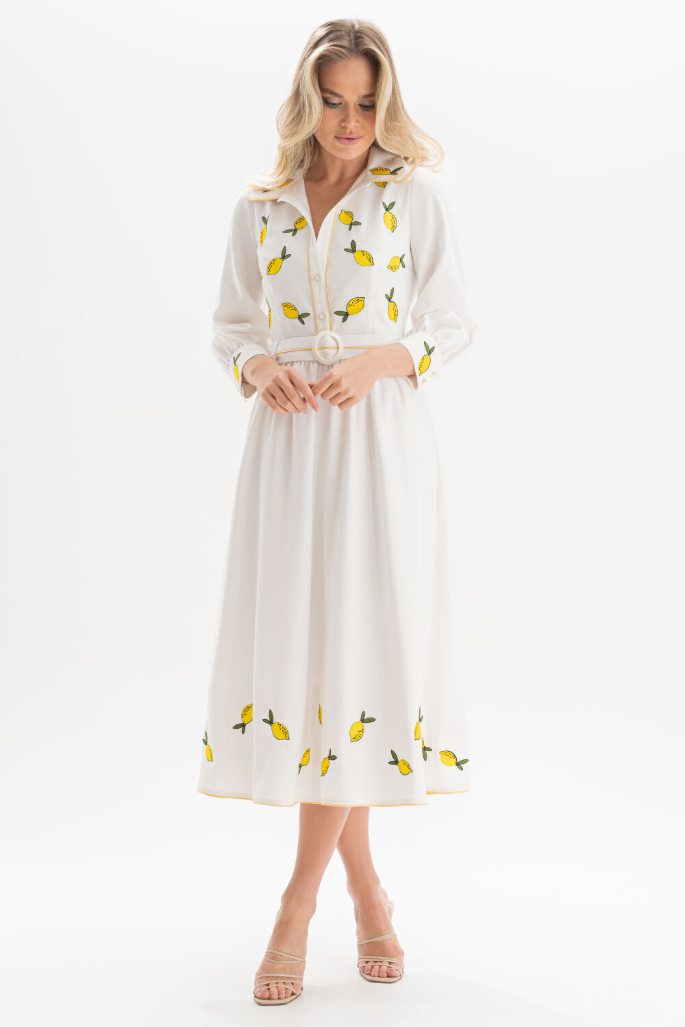 Свободный силуэт длины миди подчёркивает талию мягким поясом с круглой пряжкой. Манжеты, воротник и планка отделаны аккуратным кантом в лимонном оттенке. Классический крой сочетается с необычной вышивкой, превращая платье в главную вещь летнего гардероба.