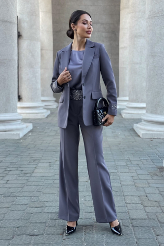 Жакет женский полуприлегающего силуэта из костюмной ткани, с центральной бортовой застежкой встык без петель и пуговиц (в носке эксплуатируется нараспашку) и с отложными лацканами. Жакет на притачной подкладке. Перед жакета с боковыми рельефными швами идущими от проймы до низа изделия и нагрудными вытачками расположенными под лацканами. Перед с прорезными карманами «в рамку» и клапанам, расположенными чуть ниже линии талии. Углы клапана - прямые. Спинка с боковыми рельефными швами от линии проймы до линии низа и со средним швом. Рукава втачные двухшовные, длинные. Низ рукава с заворотом на манжету из отделочной ткани становится длиной 7/8. Плечевой пояс оформлен при помощи плечевых накладок. Воротник пиджачного типа. Углы воротника прямые, лацканы - острые. Края борта с наклонной линией.