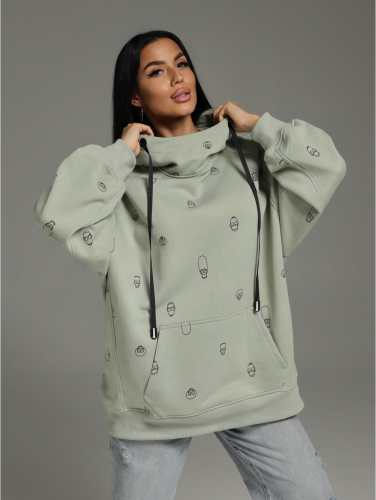 Худи – oversize кроя с притачным поясом по низу, с длинным рукавом реглан на манжете.