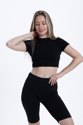 Велосипедки облегающего силуэта, с высокой линией талии. Пояс широкий отрезной с эластичной тесьмой внутри. Нижний срез обработан швом вподгибку.