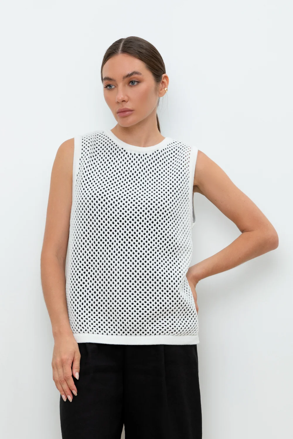 Вязаная ажурная майка. Состав 50% хлопок, 50% акрил. Благодаря акрилу в составе изделие не пилингуется. В комплекте внутренняя майка из супрема с лайкрой.