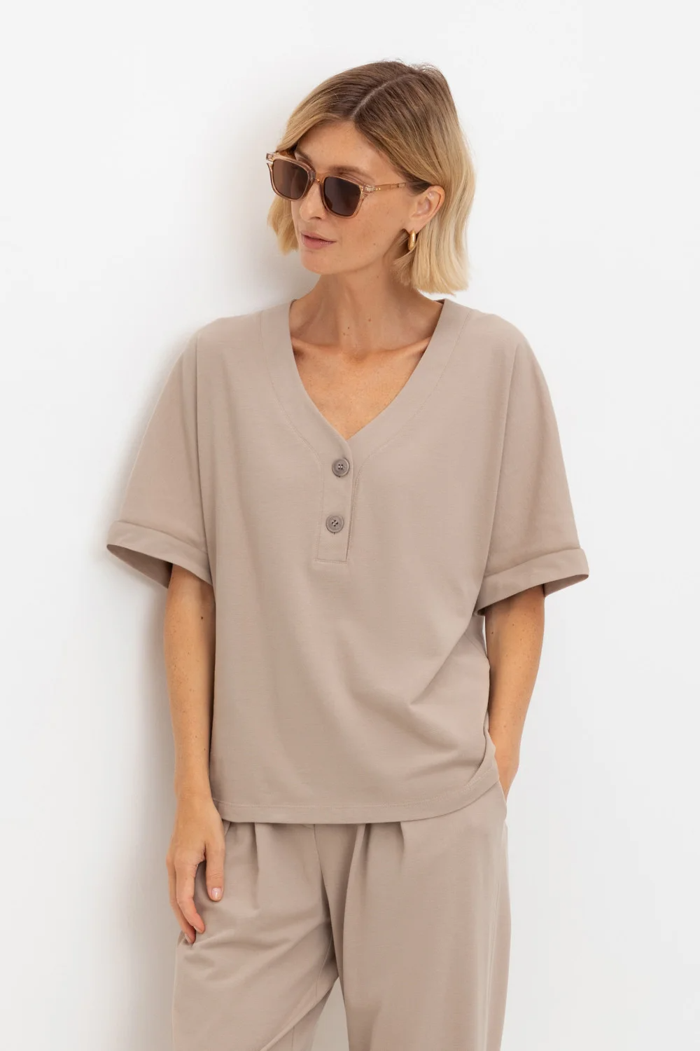 Трикотажная футболка с удлиненными рукавами изготовлена из легкого хлопка с рельефной текстурой пике. Широкие манжеты и V-вырез с пуговицами в тон изделия позволяют сочетать ее как с классическими, так и с более спортивными стилями.