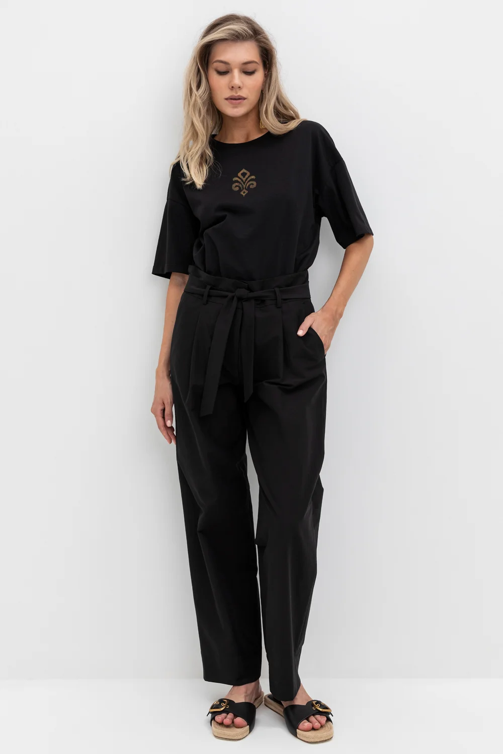 Брюки женские из смесового хлопка с добавлением эластана со съемным поясом и боковыми карманами.