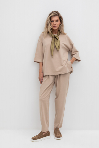 Брюки прямого кроя со стрелкой и боковыми карманами из плотного гладкого трикотажа интерлок. Застёгивается спереди на молнию и кнопку. В составе 80% натурального хлопка и 20% полиэстера, при этом полиэстер ввязан внутрь по особой технологии и не соприкасается с кожей.