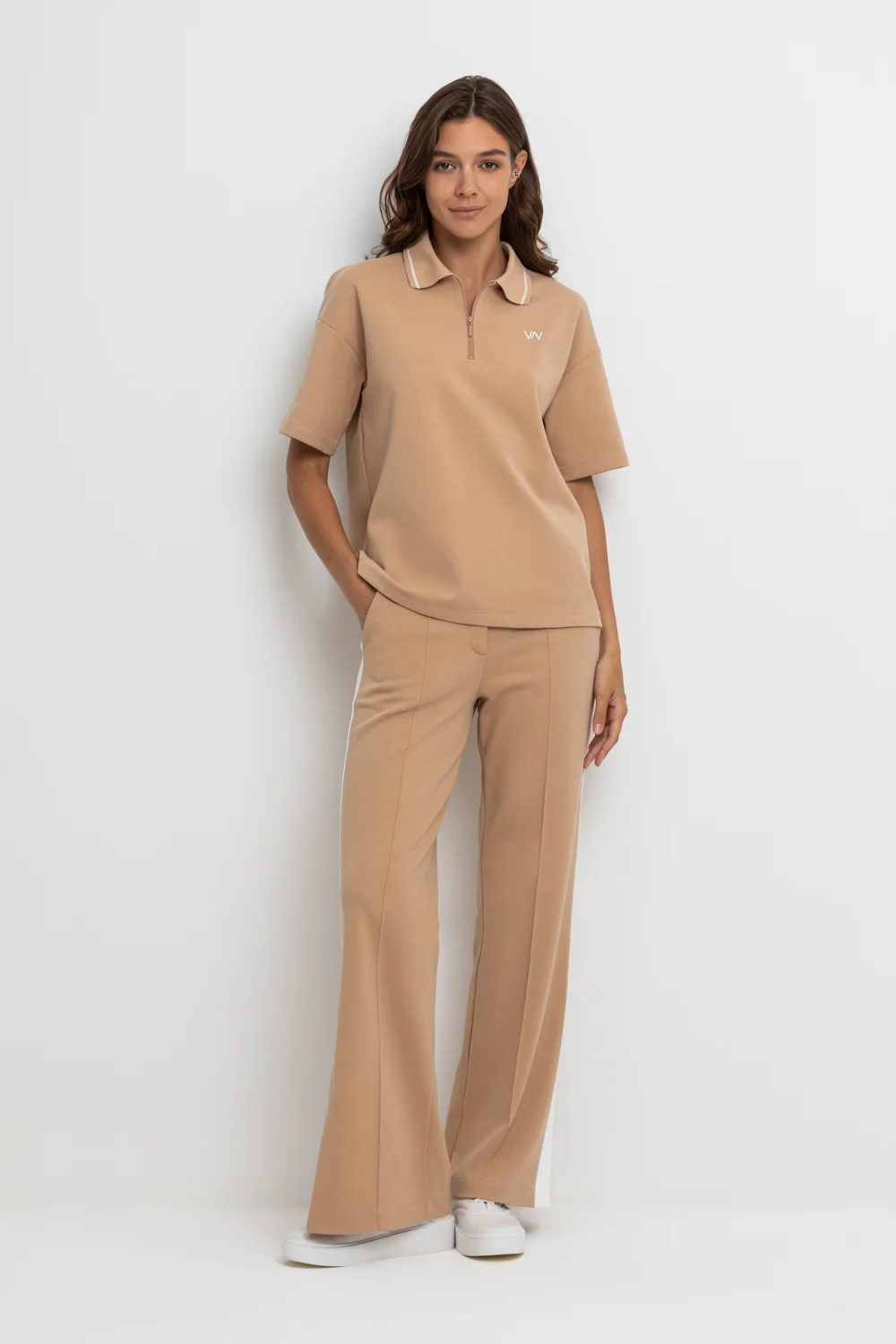 Свободные женские брюки со стрелками и боковыми карманами из плотного гладкого трикотажа интерлок. Модель с контрастными боковыми вставками и разрезами по низу. Застегиваются на молнию и кнопку. Низ обработан плоскими швами. Все трикотажные полотна производятся в соответствии с нормами Швейцарского сертификата ЭкоТекс. Сделано в России