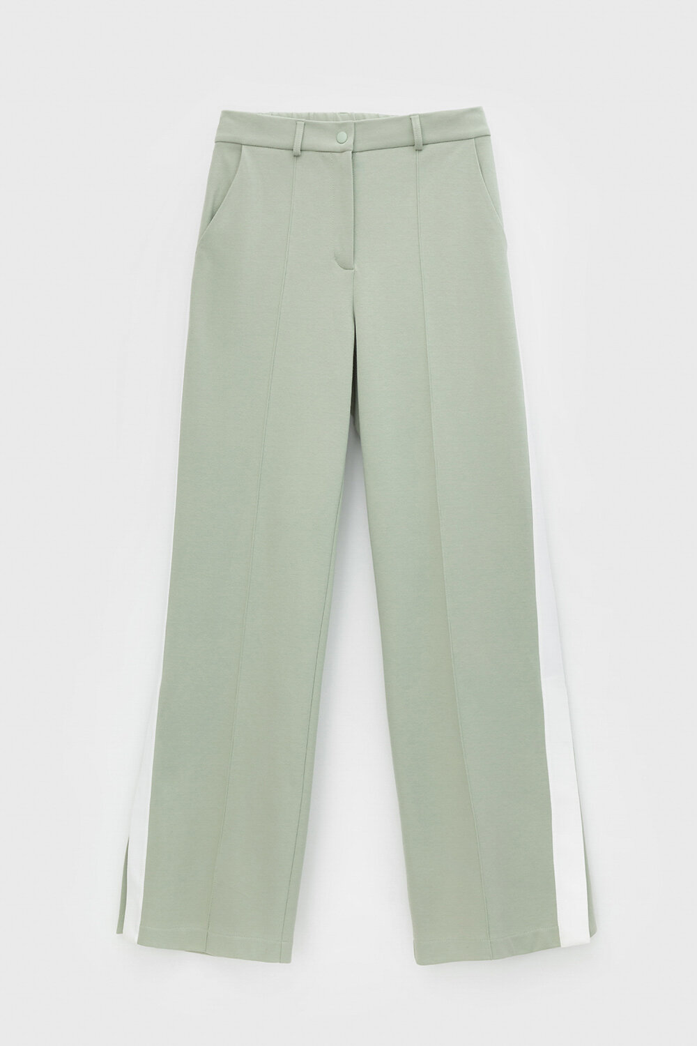 Свободные женские брюки со стрелками и боковыми карманами из плотного гладкого трикотажа интерлок . Модель с контрастными боковыми вставками и разрезами по низу. Застегиваются на молнию и кнопку. Низ обработан плоскими швами . Все трикотажные полотна производятся в соответствии с нормами Швейцарского сертификата ЭкоТекс. Сделано в России