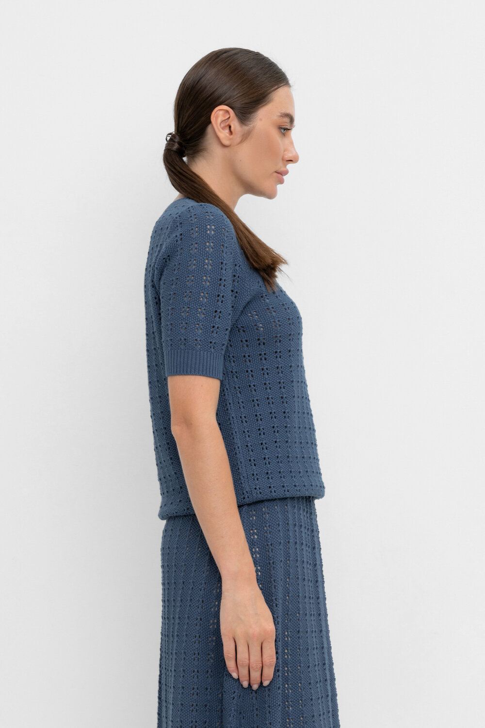 Укороченная вязаная ажурная футболка. Манжеты и пояс, связаные ластиком, придают изделию небольшой объем. Состав 50% хлопок, 50% акрил. Благодаря акрилу в составе изделие не пилингуется.
