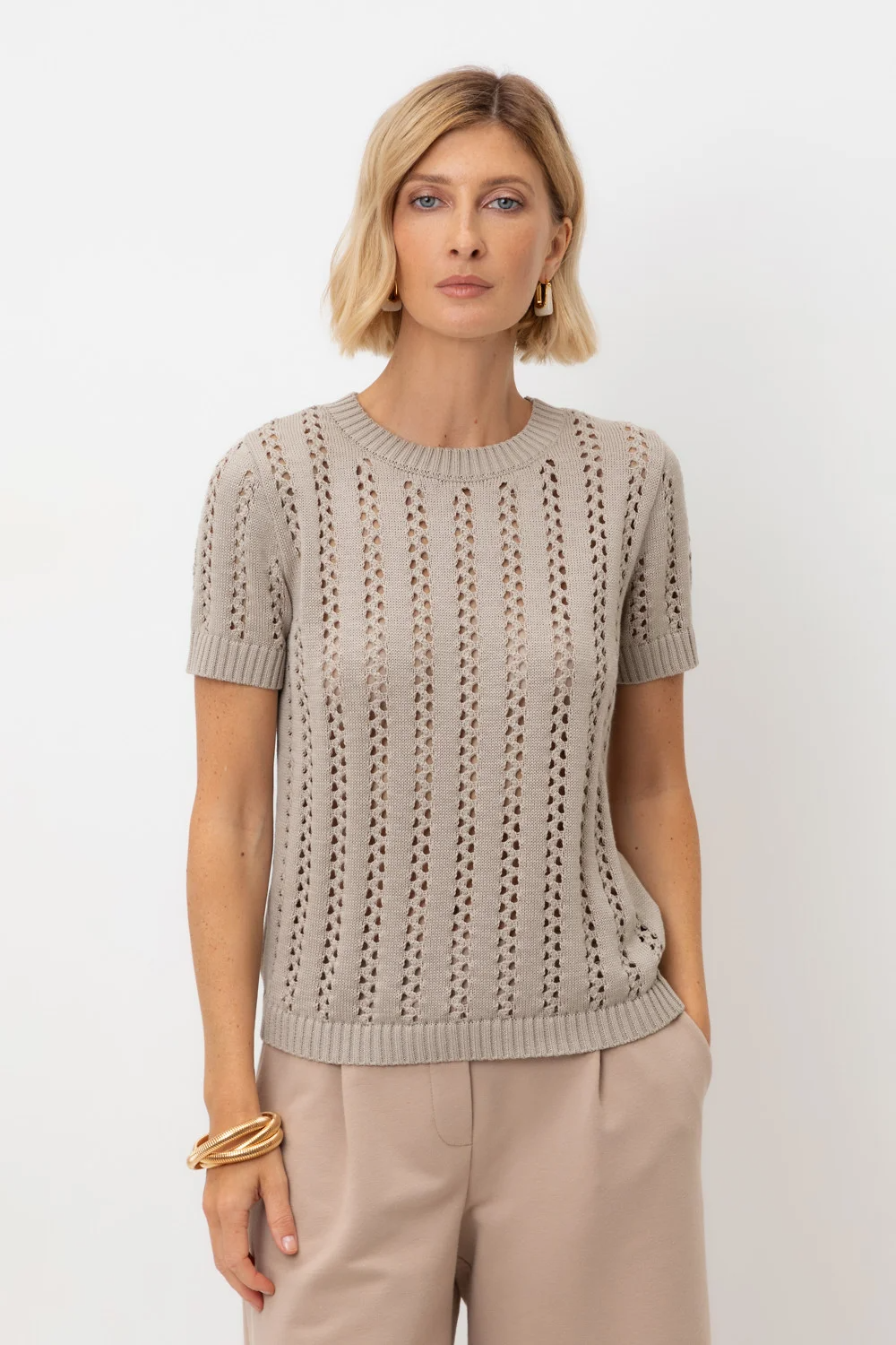 Джемпер из итальянской хлопковой пряжи выполнен ажурной, воздушной вязкой. Бежевый цвет и фактура делают его универсальным для различных образов.