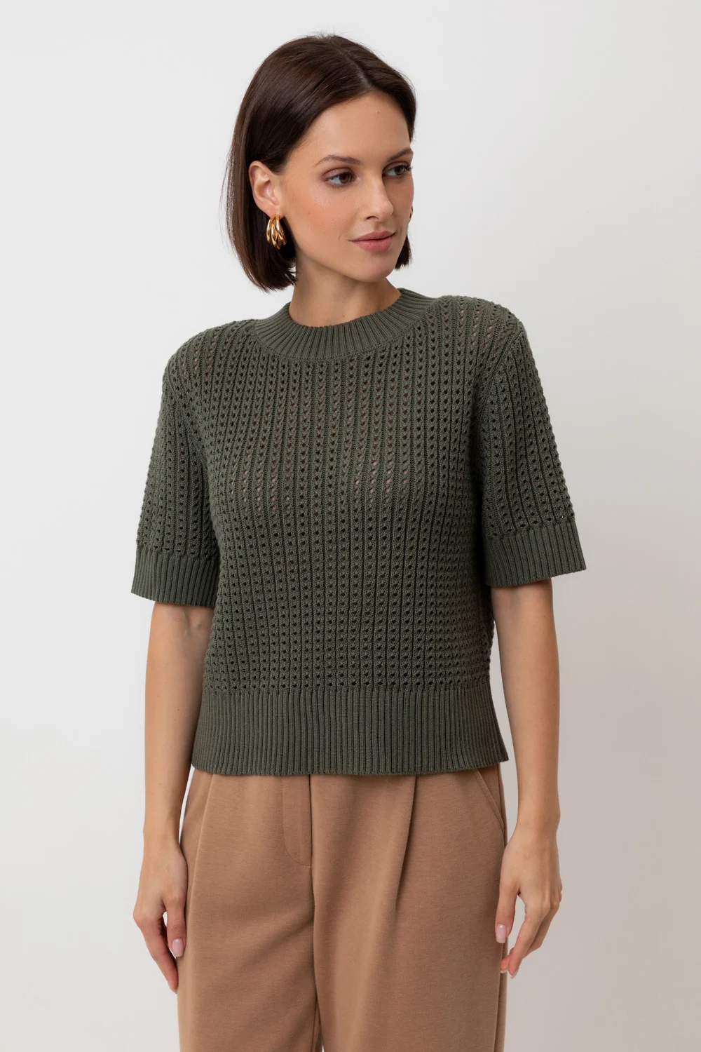Джемпер с коротким рукавом ажурной вязки из итальянского хлопка. Умеренное переплетение, хлопок в составе придают изделию форму и дают ощущение комфорта во время носки. Незаменим в повседневном летнем гардеробе.