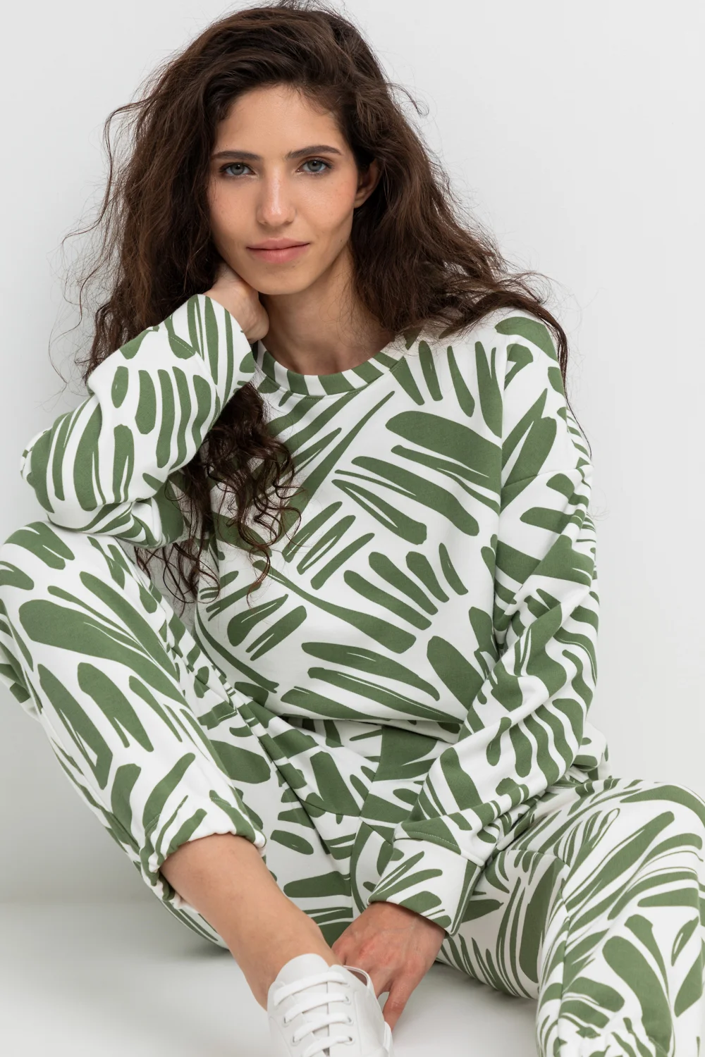 Мягкая женская толстовка из набивного футера трехнитки. Спущенные рукава и манжеты добавляют объем.