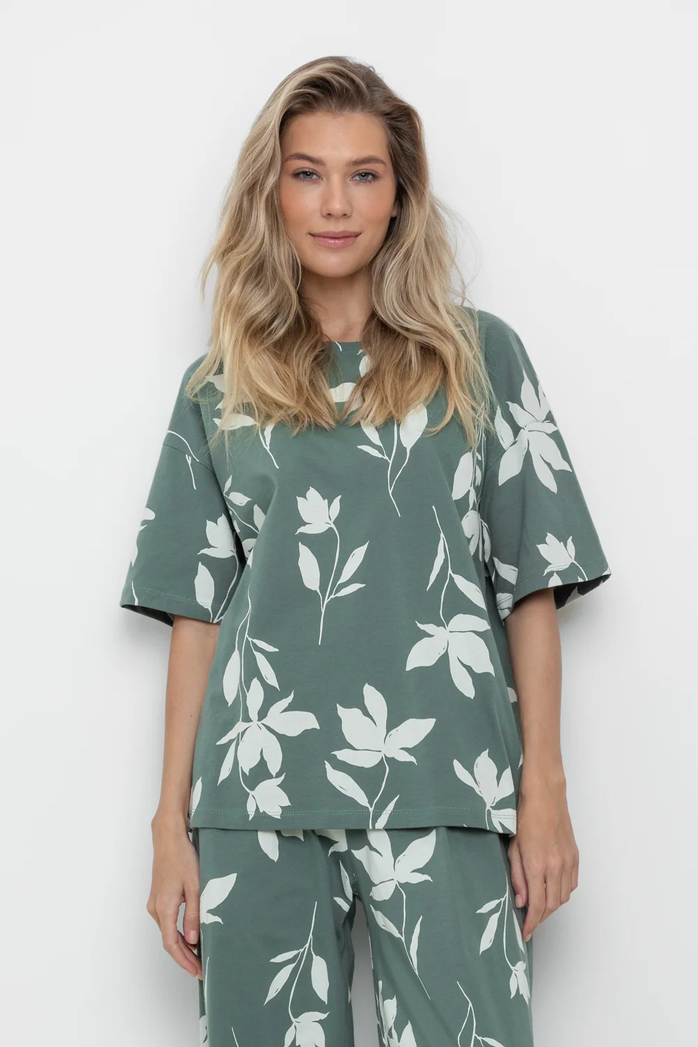 Свободная футболка из набивного трикотажа супрем. Спущенное плечо придает изделию свободный силуэт.